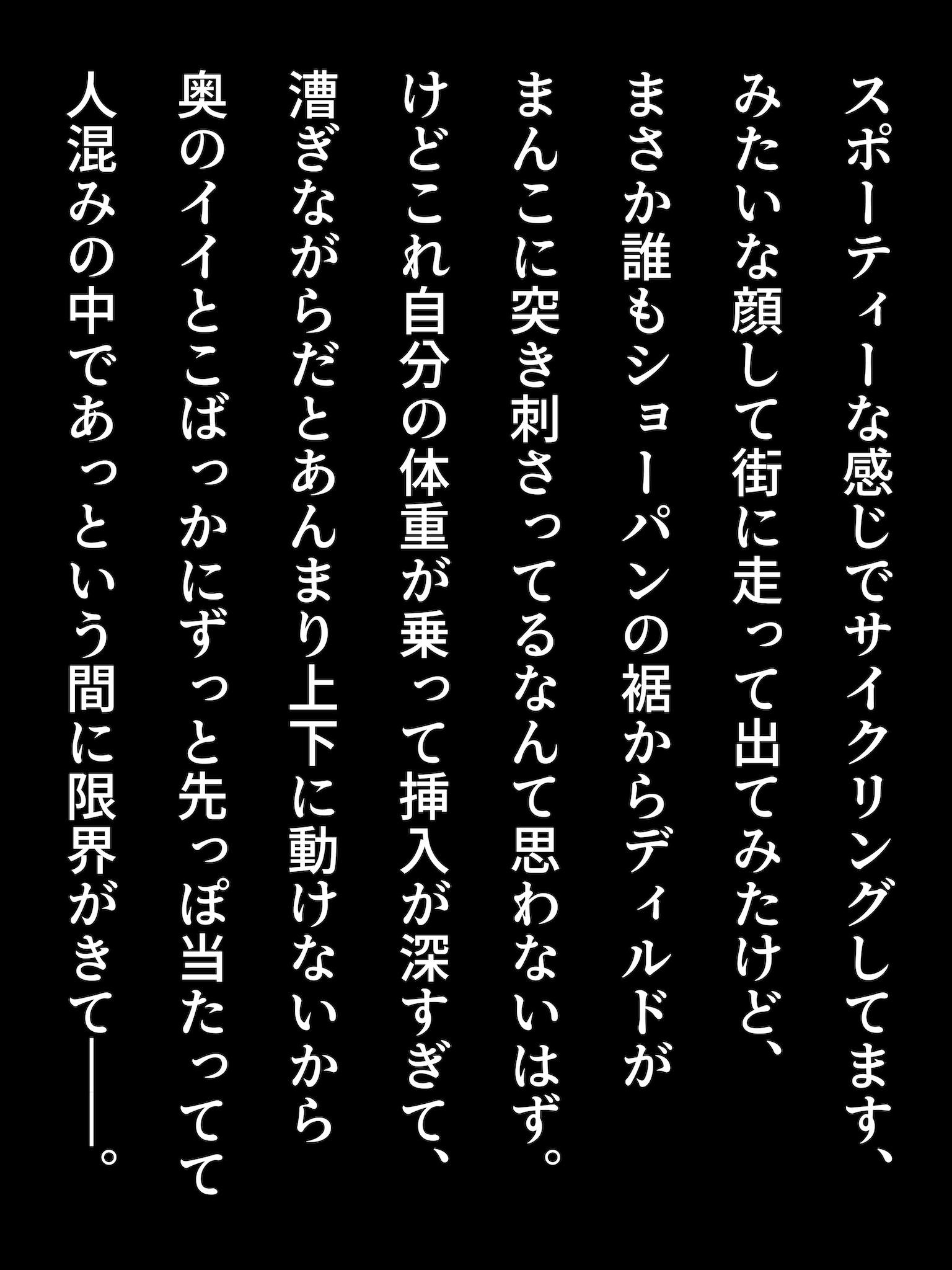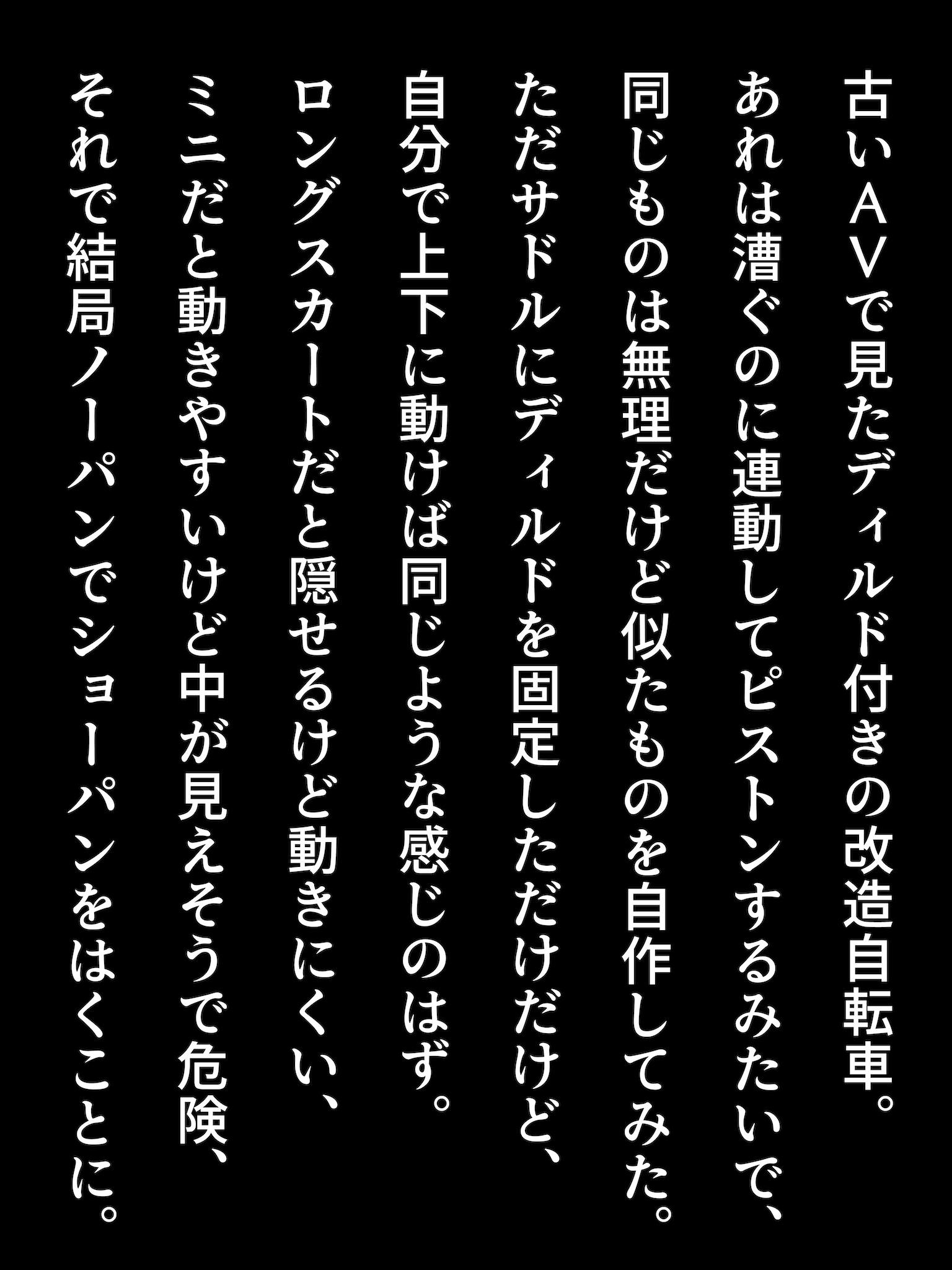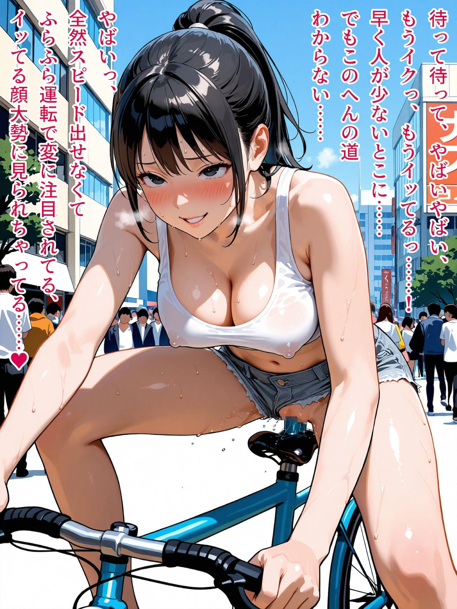 こちらのイラストも本作に収録しているもので、アクメ自転車もどきを自作して昼間から混雑する街なかへ飛び出していってしまった露出女子のエピソードになってます。