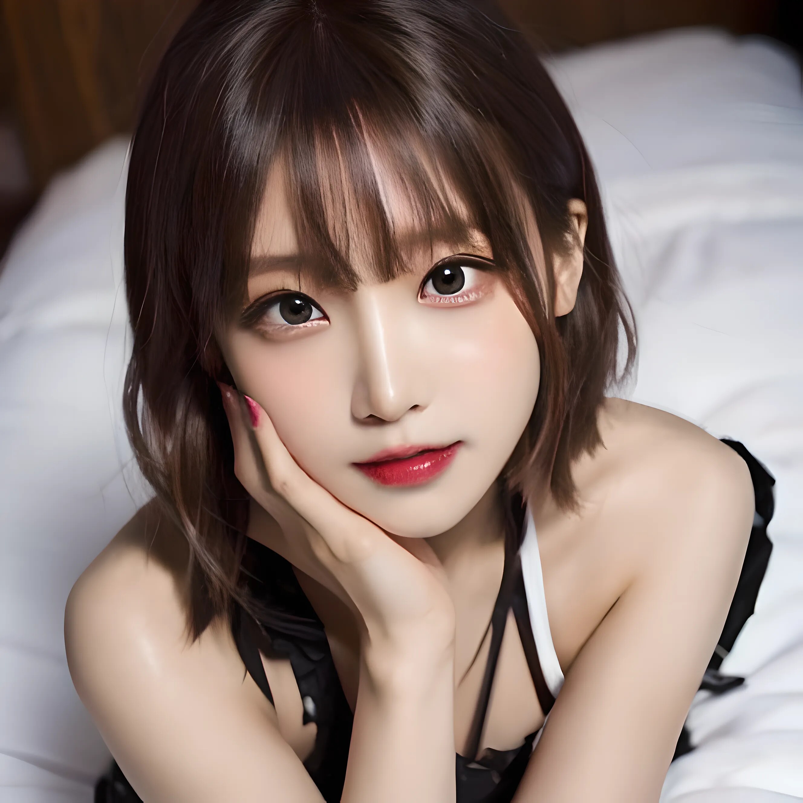 BREAK (細いウエスト:1.9)、(細い体:1.9)、(色白:1.5)、(透明肌:1.5)、ベッドに横たわる、寝室の背景