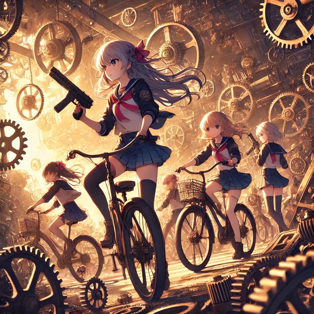 少女たちが自転車に乗り、拳銃を手にしながら廃墟を巡回する姿は、まるでその場所を守る者たちのようです。