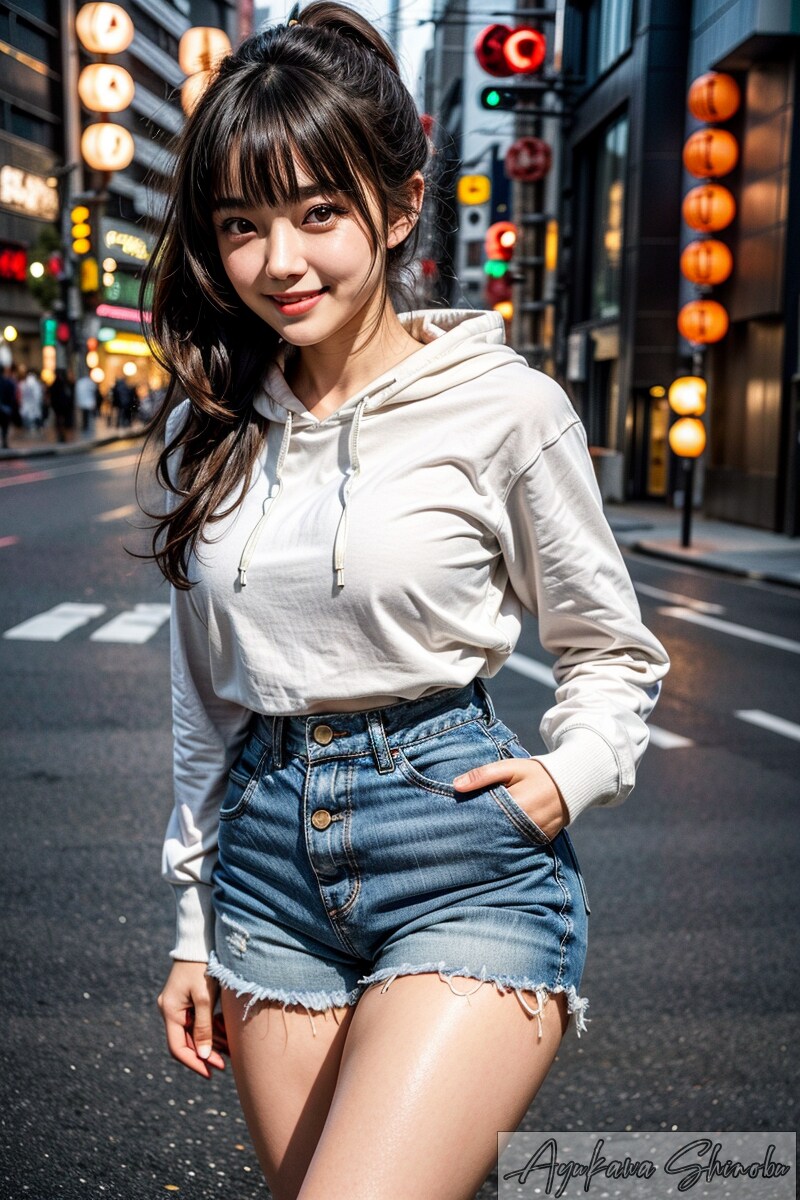白いパーカーにデニムのショートパンツを穿いた女の子