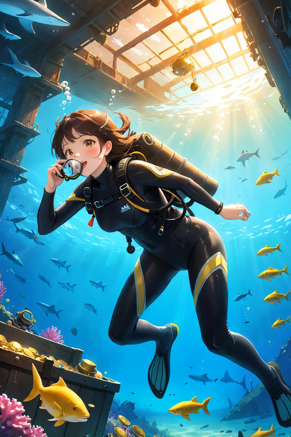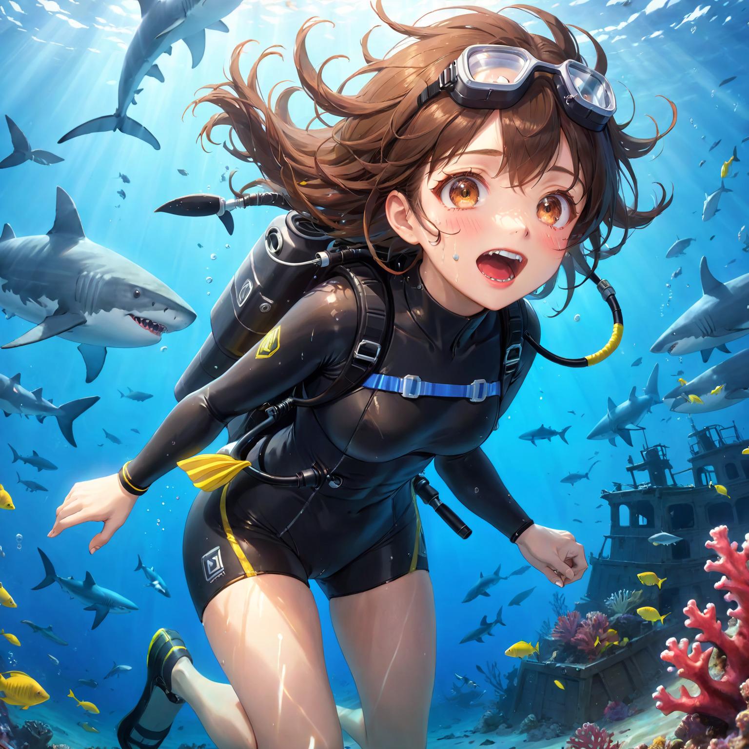 海底はサメがウヨウヨしていたが、私はすべてはねのけ進んで行くと、海底には古びた沈没船があった。