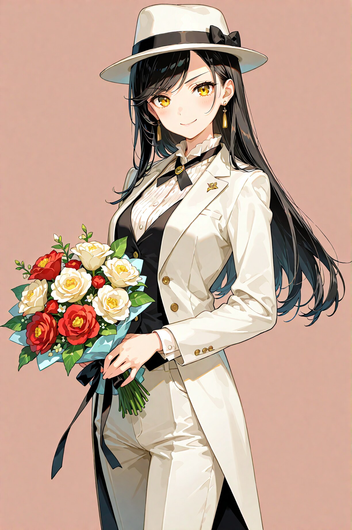 こちらは白のジャケットにパンツ、帽子は中折れ帽フェドーラ(fedora)を指定してみています。昔のクラシックな映画によく出てくるやつですね。