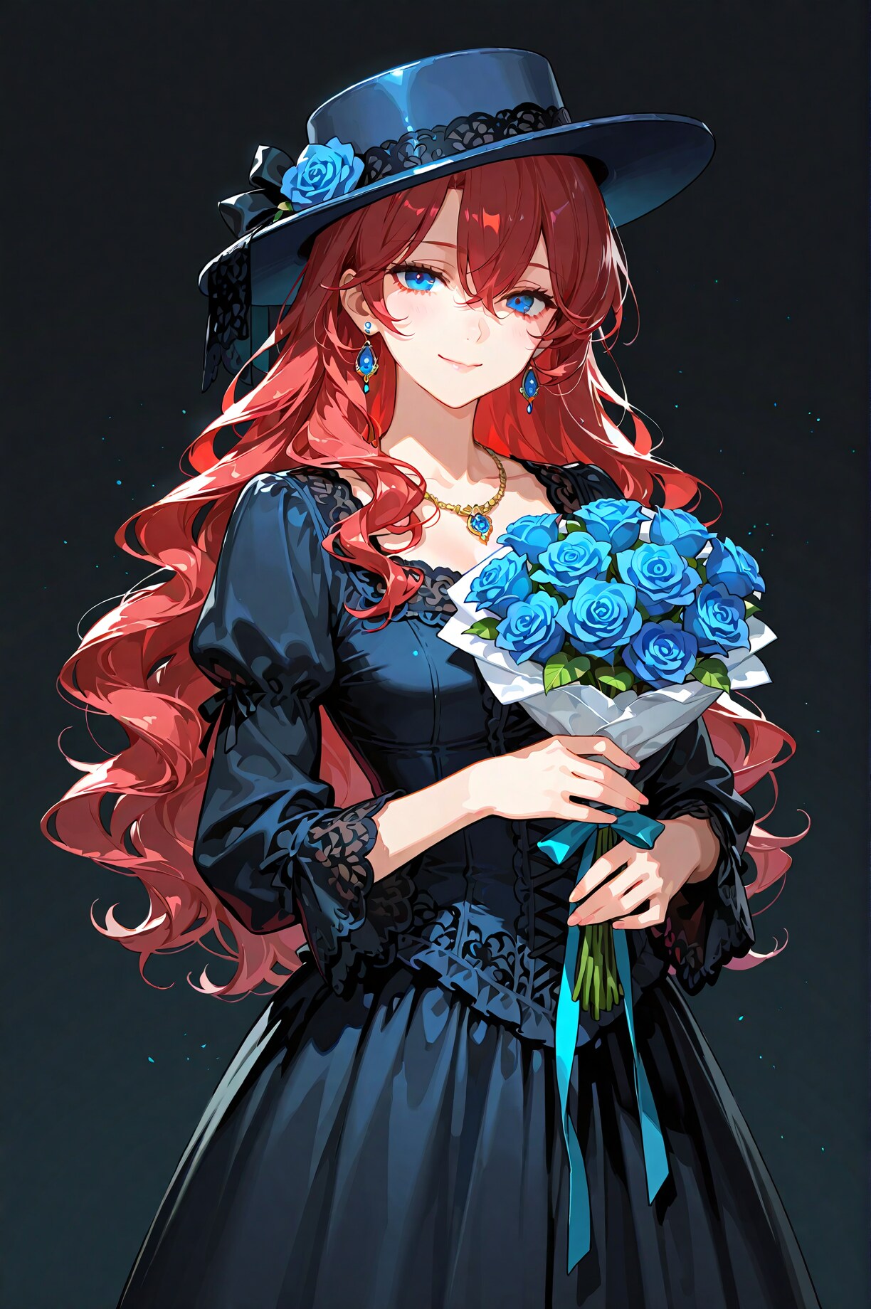 服は青紫のゴシックなドレス。彼女はこれまでも時々帽子をかぶっていて、服装に合った帽子に自動的になることも多かったです。今回はカンカン帽(boater hat)を指定してみました。つばがちょっと小さくなりました。正確にはカンカン帽は夏のファッションアイテムだそうですが、まあいいや😋