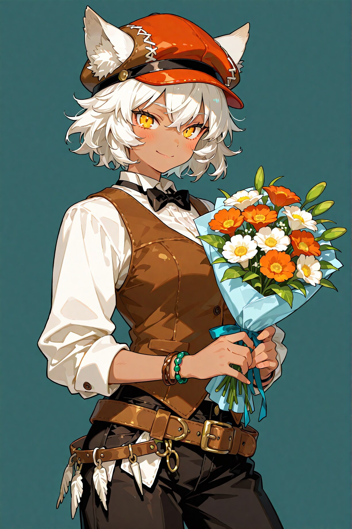 シャツにベストに蝶ネクタイ、帽子はカジュアルなキャビーハット(cabbie hat)というものを指定。米英語でタクシー運転手が被っていたそうです。キャスケット(Casquette) とあんまり変わらないみたいですね。けもみみ用に穴が開いた面白い帽子になりました。