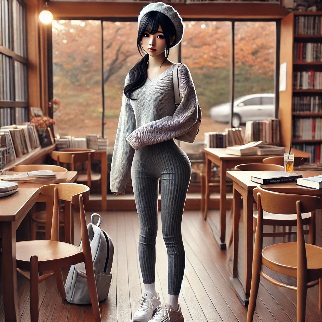 秋の休日、図書館やカフェでゆったりと読書を楽しむスタイル。静かな場所で勉強や趣味に集中する場面に似合う、知的で洗練された印象です。
