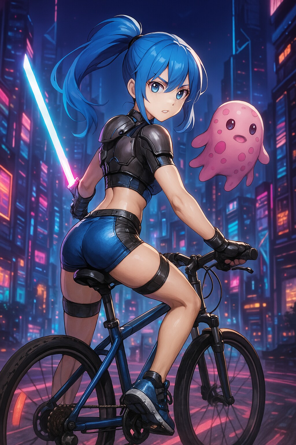 さらに彼女の背後には、ピンク色の生体細胞でできた「ももほうくん」と思しきゆるキャラ風のマスコットが浮遊しており、都市の秘密や異星由来の量子知性体に関わる手がかりを持っている可能性が示唆されています。全体としては、「調査任務に出た青ぽにちゃんと、未知のテクノロジーに満ちた都市」といった謎と期待感を抱かせる一枚となっています。