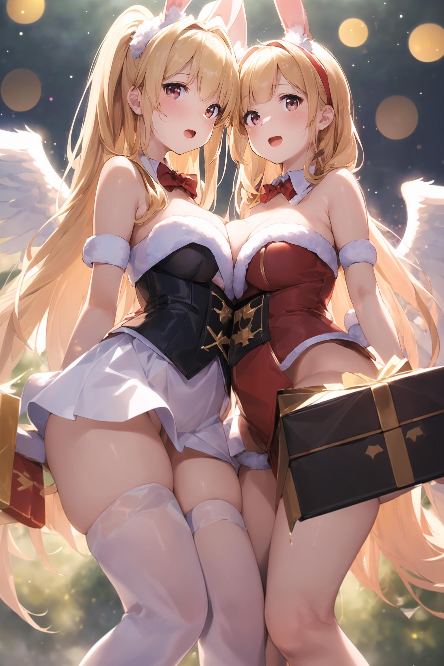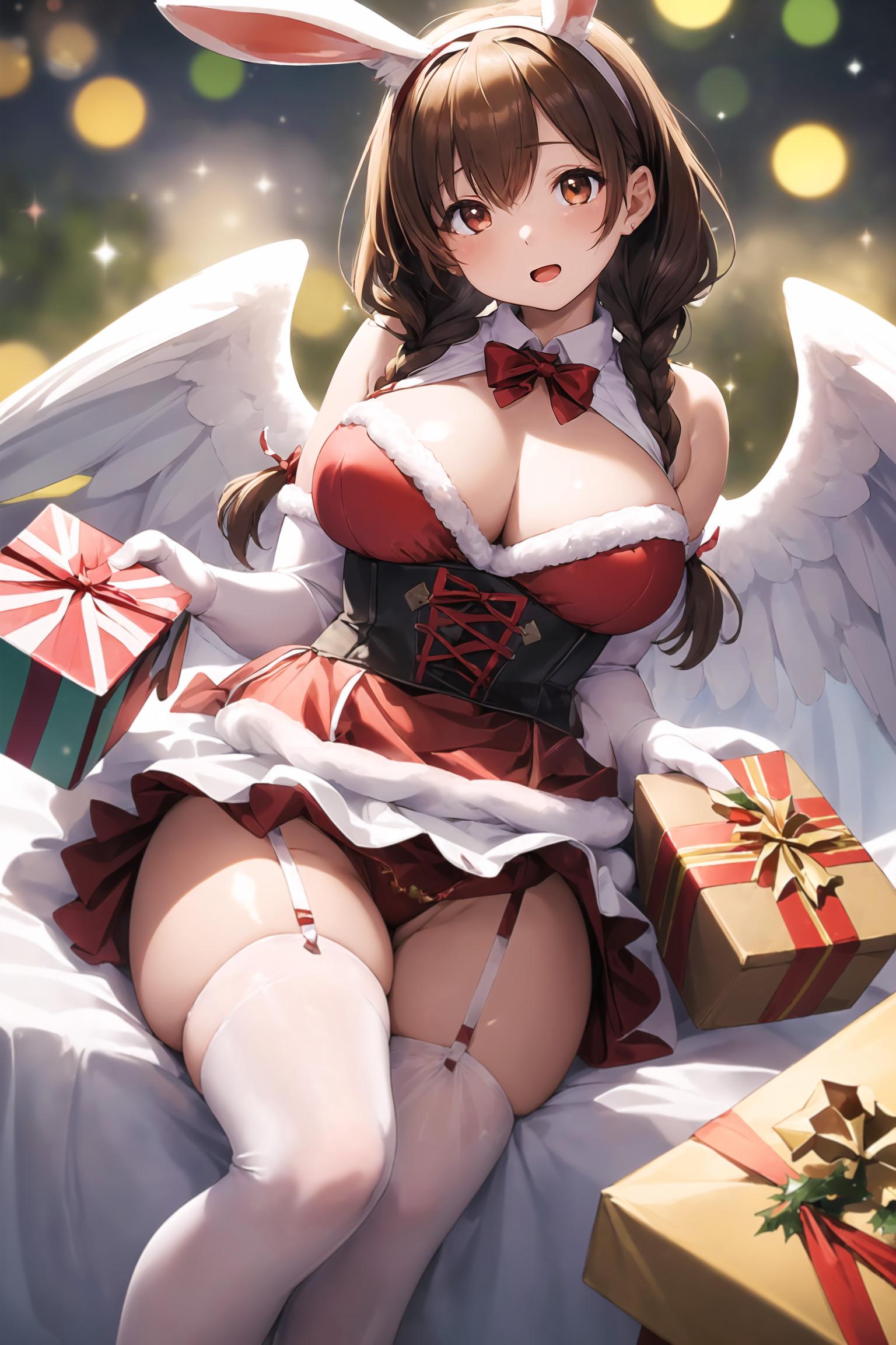 サンタ衣装はsanta costume,twin braids, red fur-trimmed capelet, red ribbon, red bowtie, fake rabbit tail, fake rabbit ears, necklace, knee highs, corset, garter strapsを使用。 翼はangel wingsです。