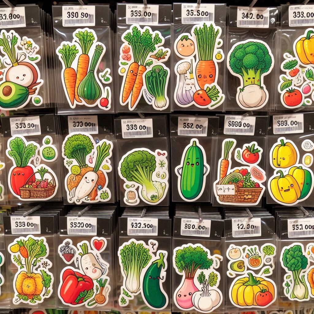 絵ではかなり多いですけれど、お野菜シールだけで普通はこんなに場所取らない気がしますので、ここはシール売り場全体も結構大きいかもしれないですね。