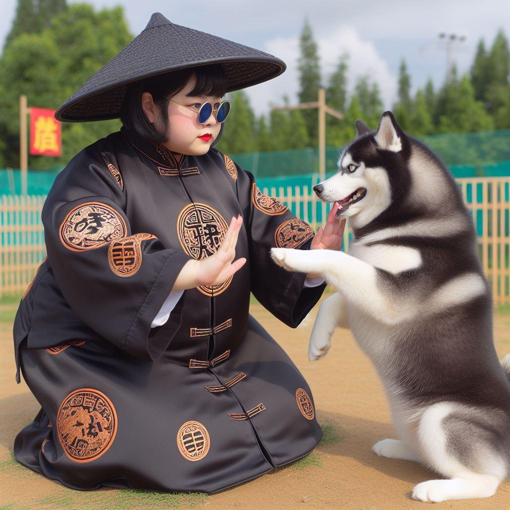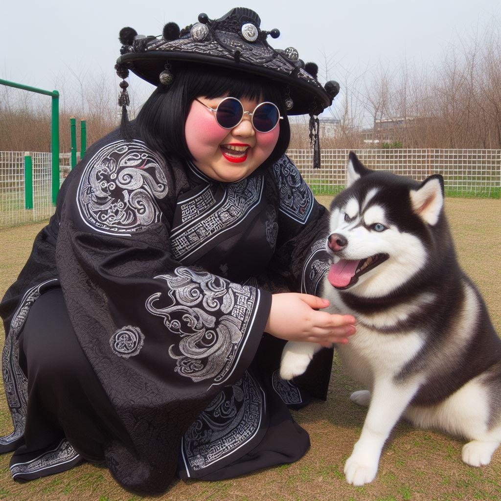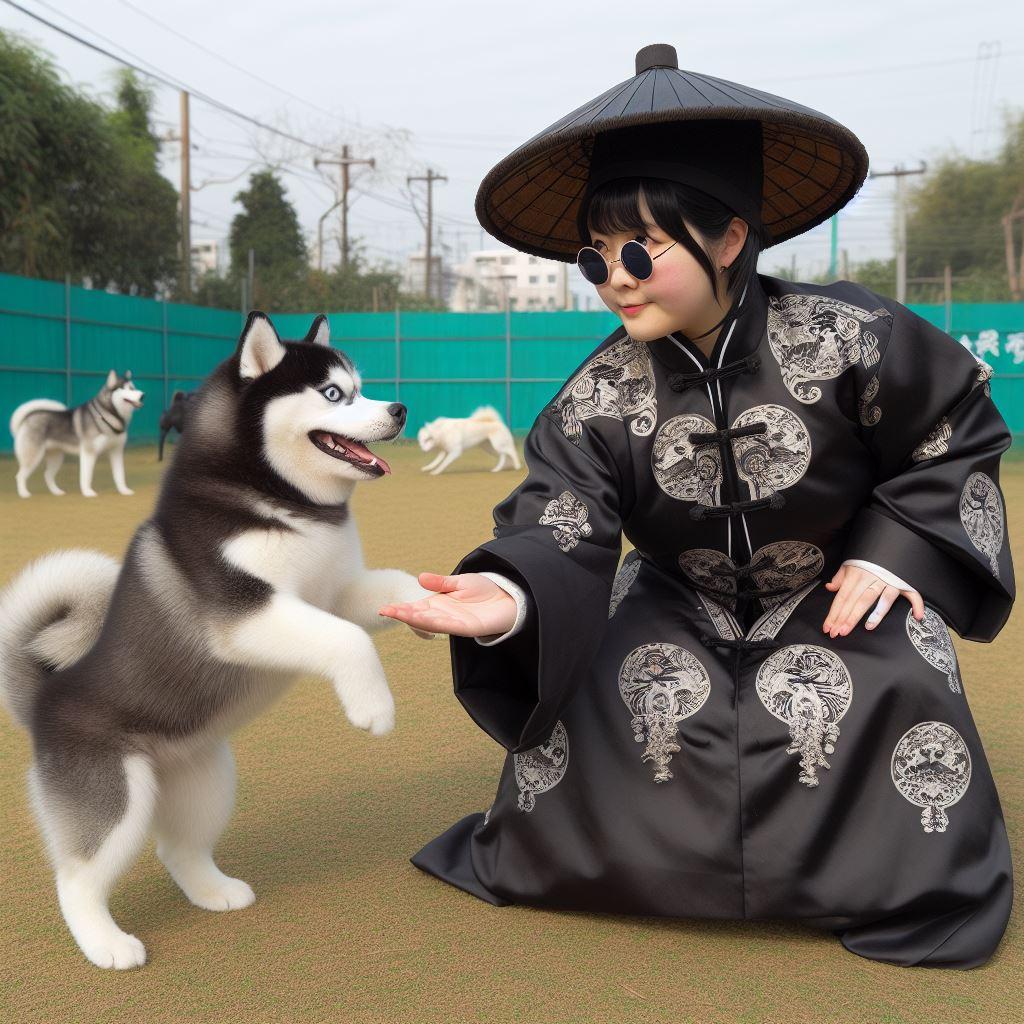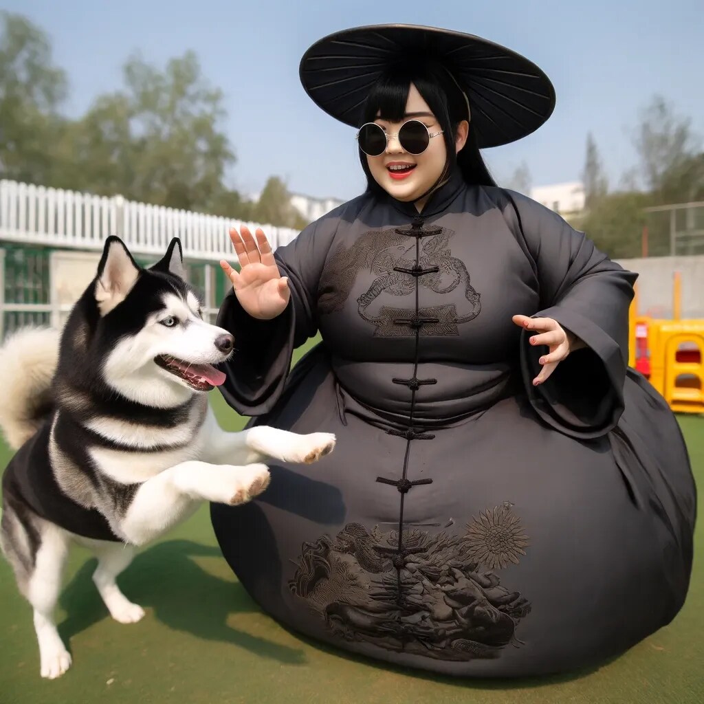 パラレルワールドか過去の話か、プラスサイズモデル化した風水師ちゃんがハスキーと運動中の画像を生成しました。異世界担当なのでw