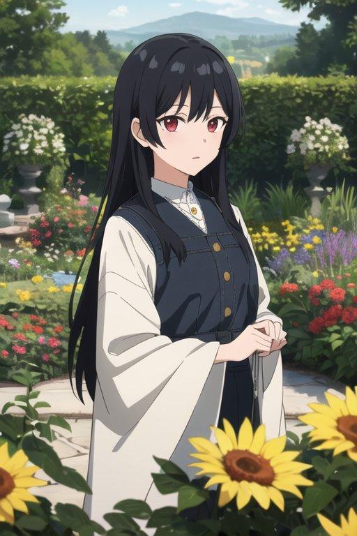 ヒマワリを見つめる女の子。