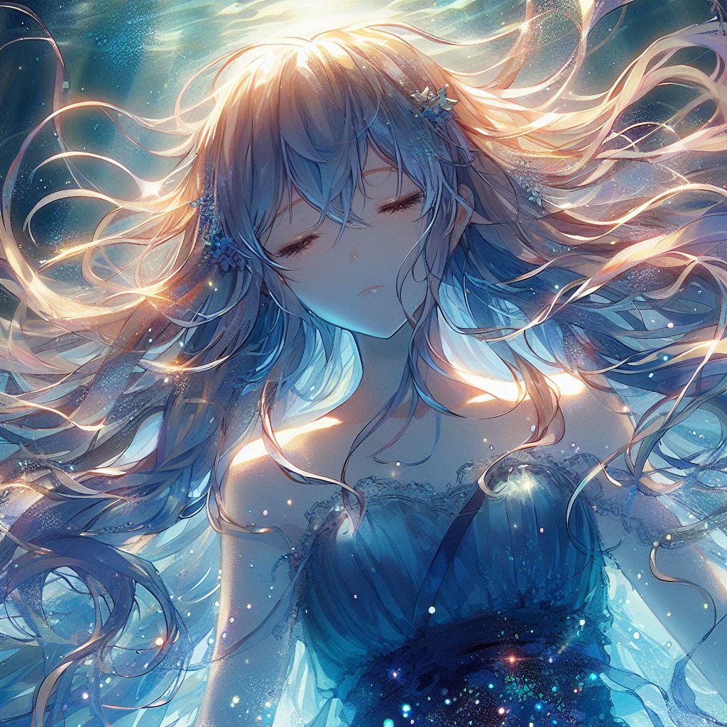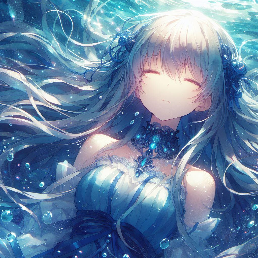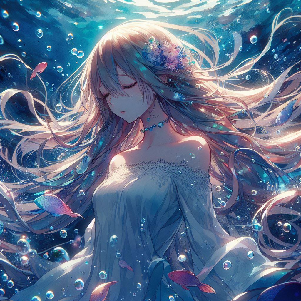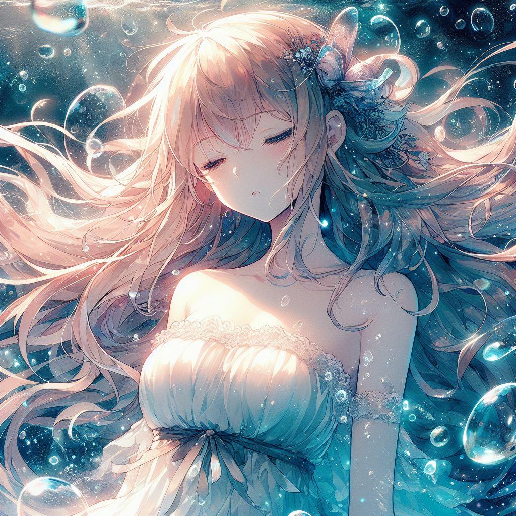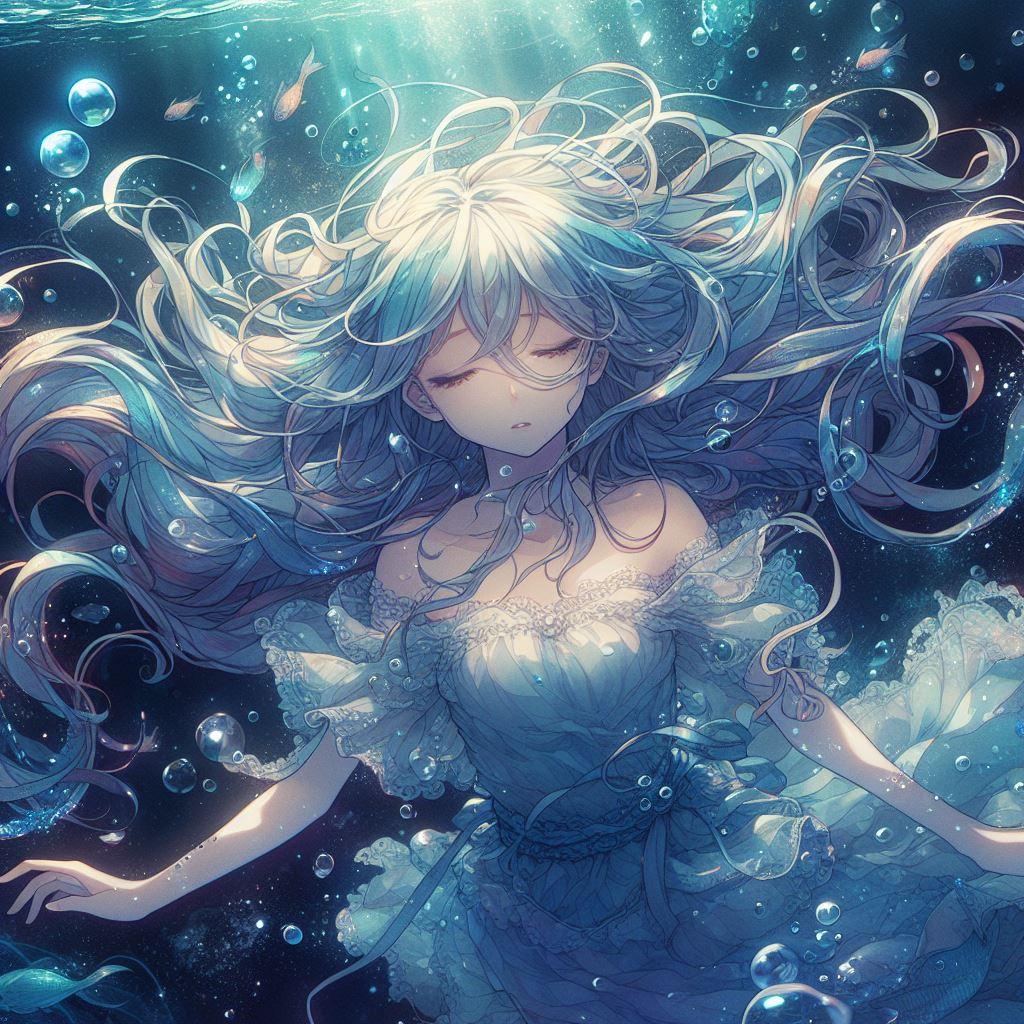 1~6枚目はプロンプト記載通りですが、7~12枚目は「息吹が水泡となって浮かんでいる」部分を抜いています。結構違う見え方になって、どちらも作者としては気に入っています。