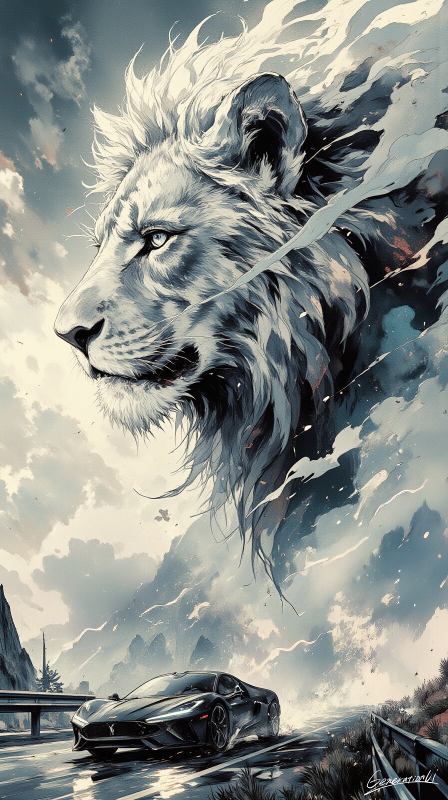 空を割るように浮かぶ巨大なライオンの輪郭。