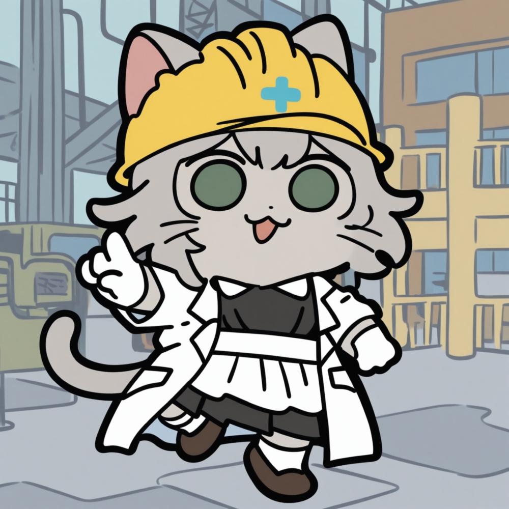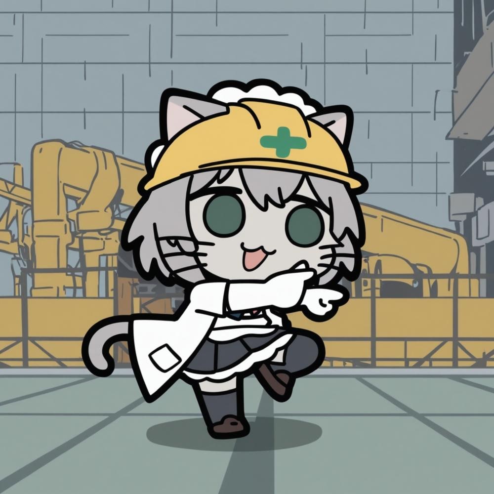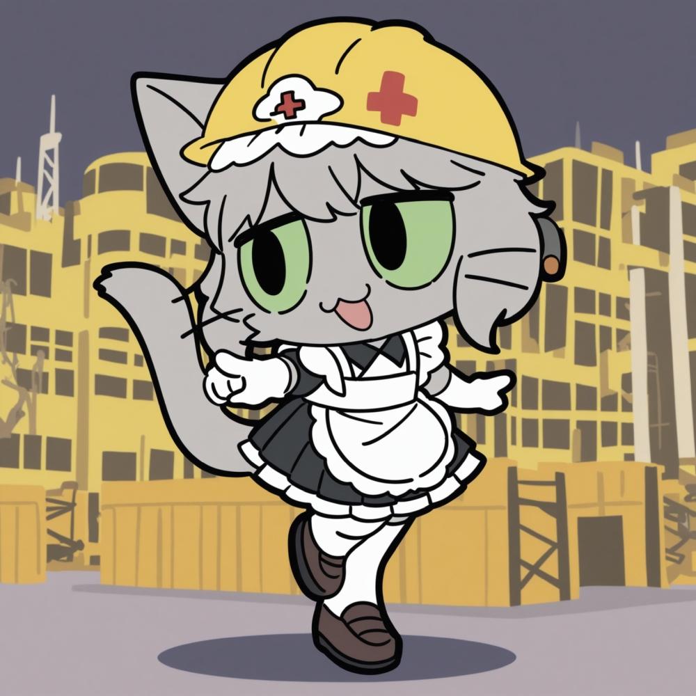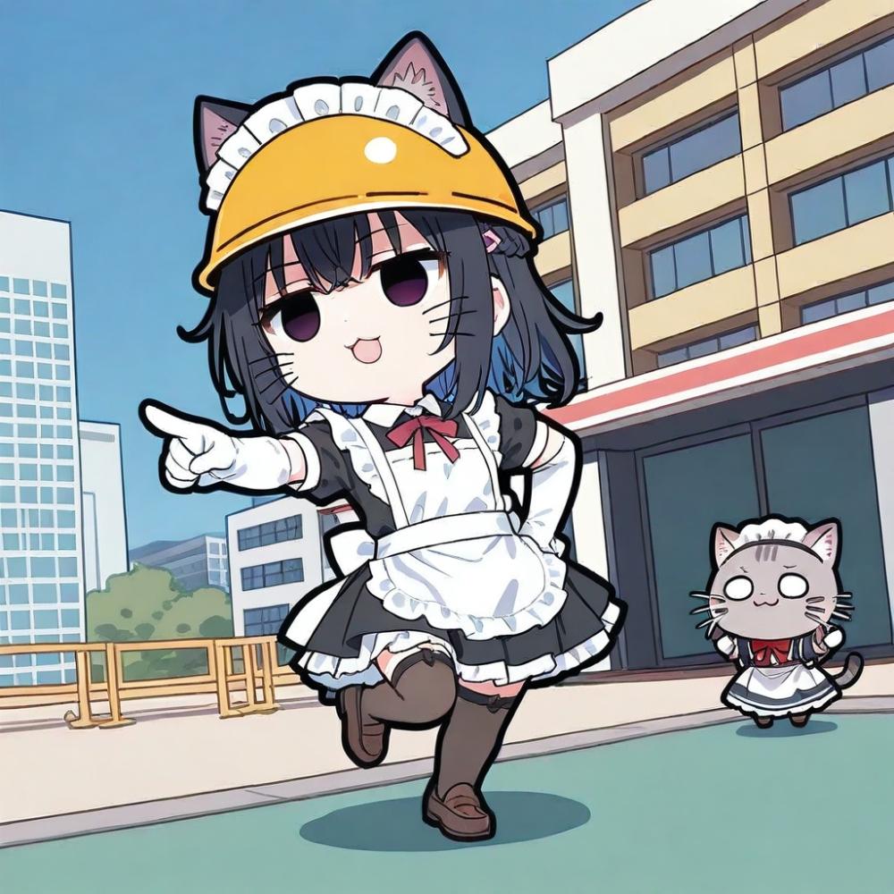 SDチビアニメ風、指差し現場猫メイド女医コスプレ人妻
