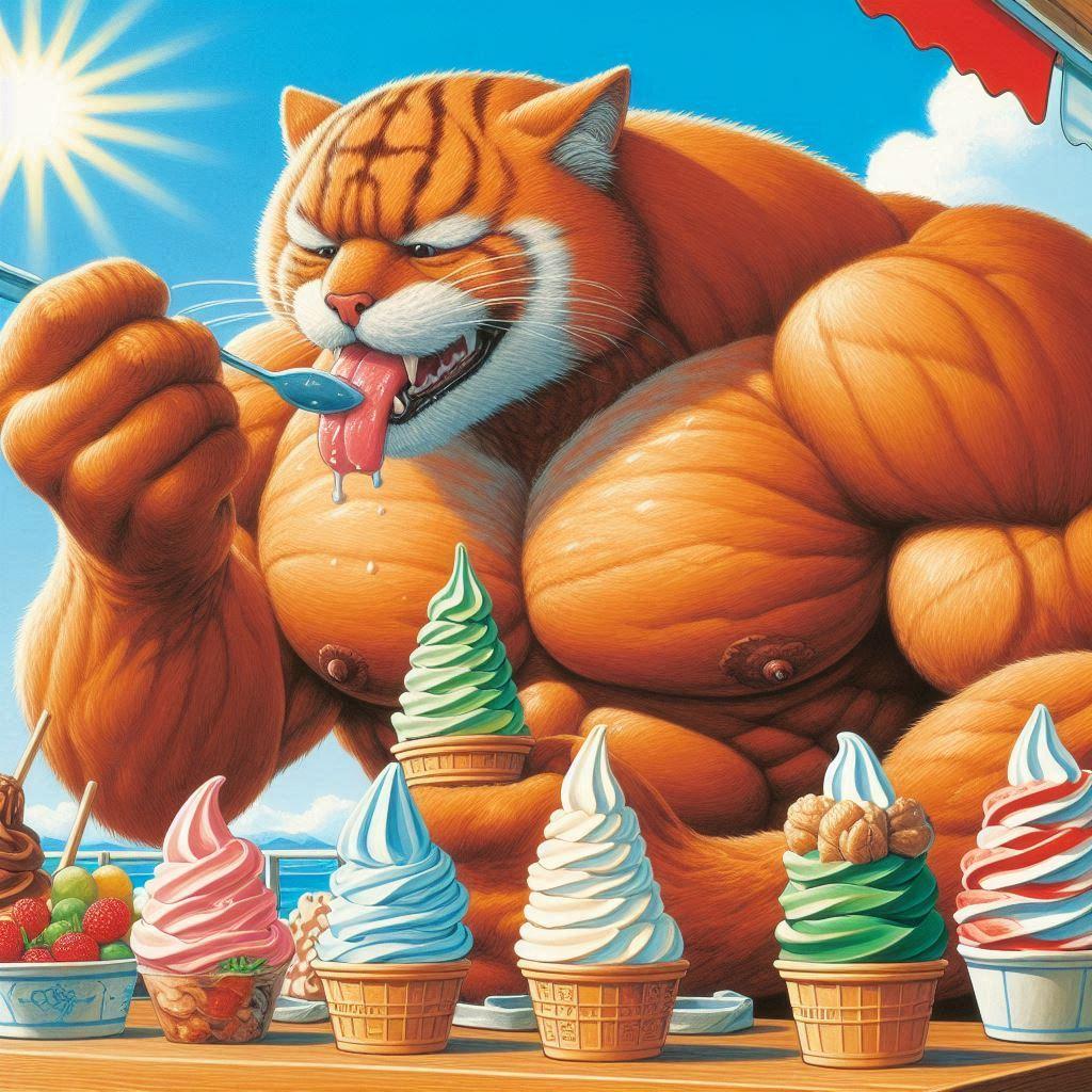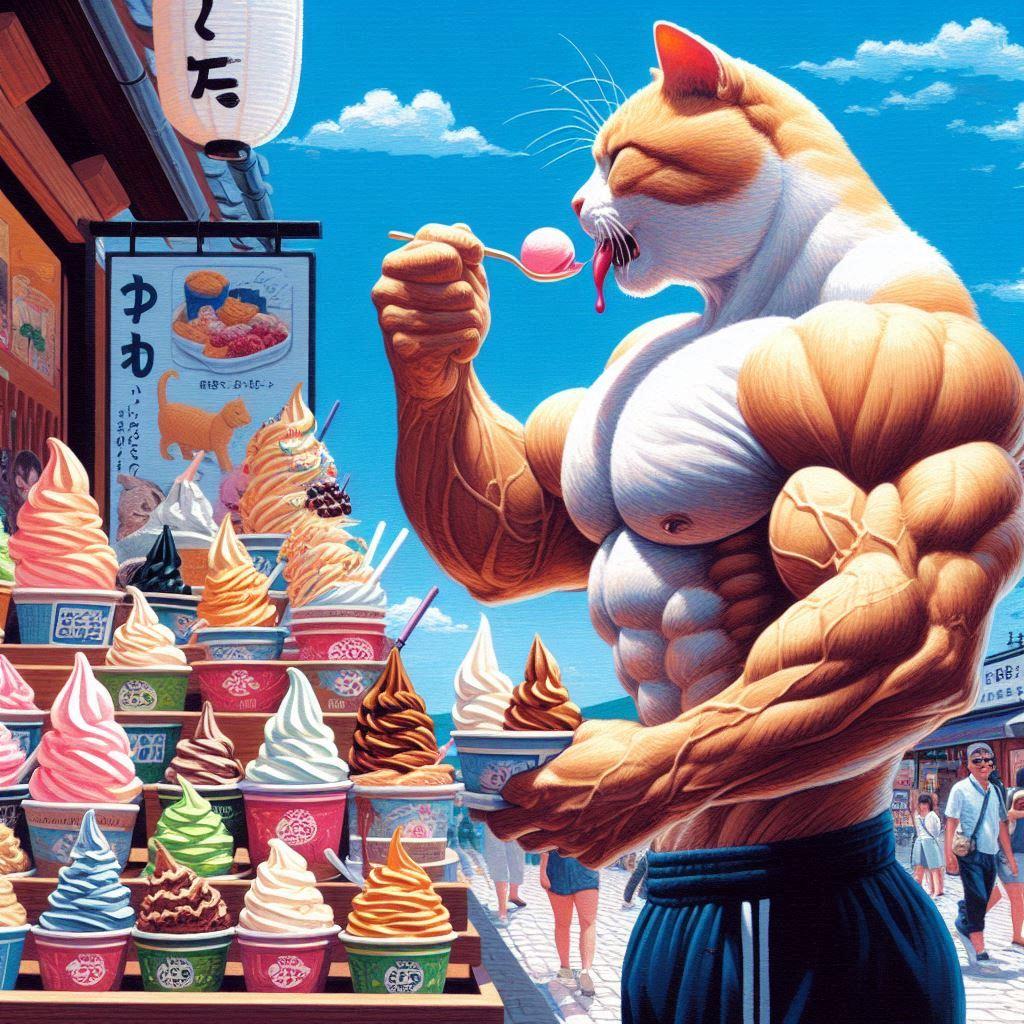 アクリル風 観光地ソフトクリーム専門店でソフトクリーム全種類を食べる筋肉猫