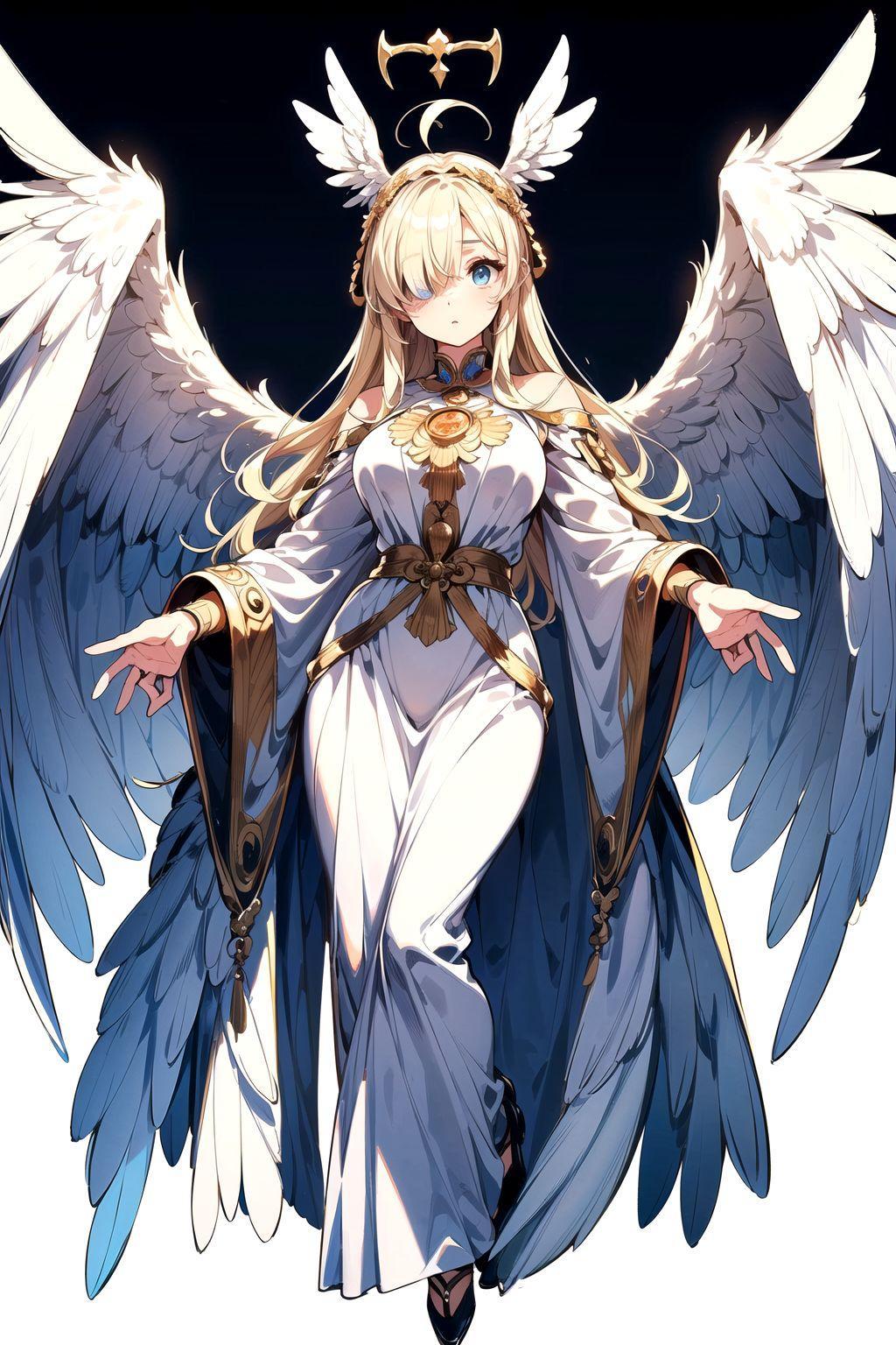 (ソロ)、(2Dキャラ:1.2)、(全身:1.5)、(金髪、ロングヘア)、(hair over one eye:1.3)、(巨大目、青目)、(古代ギリシャ衣装:1.3)、(美しい女性)、(羽の翼、白い翼、天使の翼)、(ムチムチ、超巨大乳)