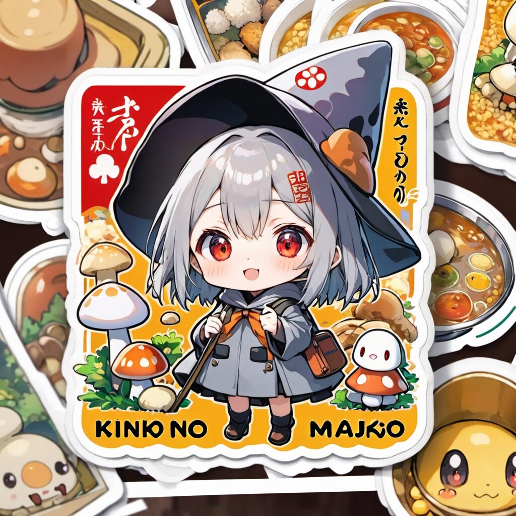 銀髪ショートボブ、赤い瞳、グレーのダッフルコート、きのこの魔女帽子、とかいうプロンプトを主に入れています。