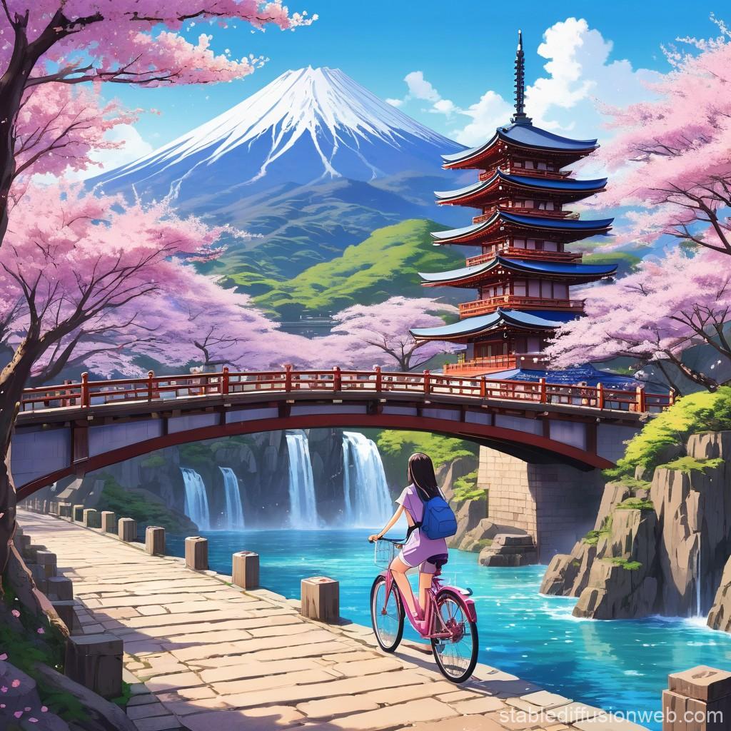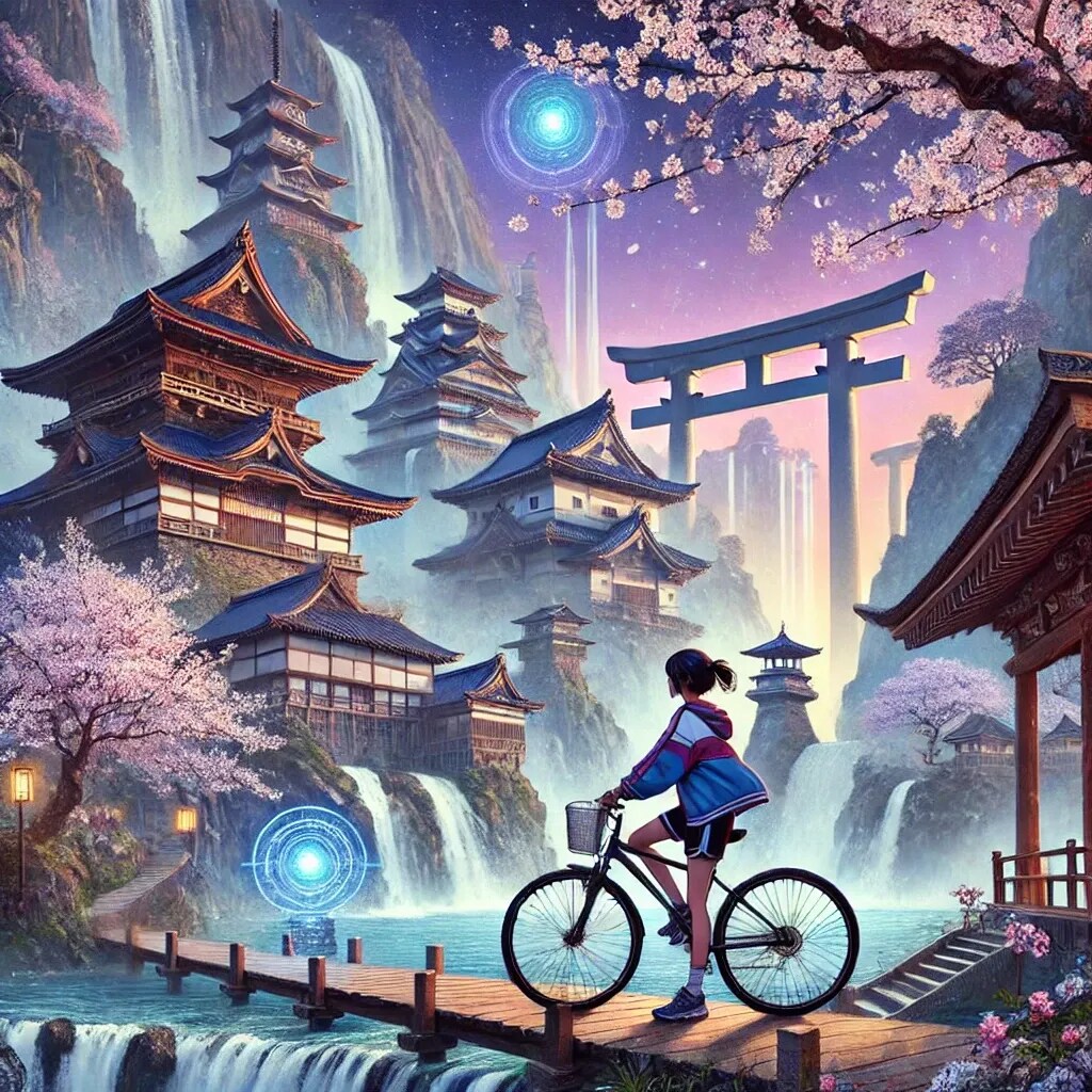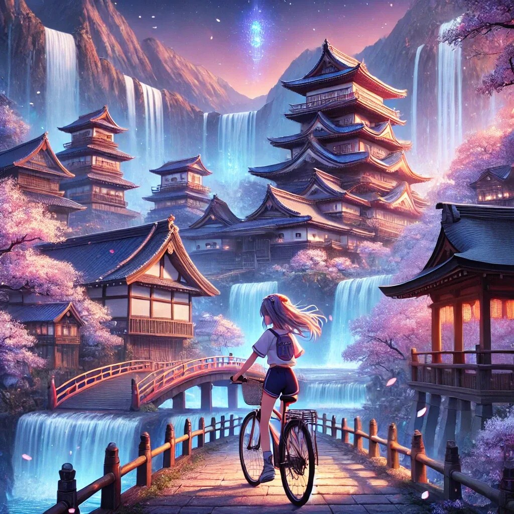 背景の青紫の神秘的な光が、どこか未来的な雰囲気を加え、伝統的な和風建築と近未来的な要素が融合した幻想的な異世界を演出しています。🌸🚴♀️✨