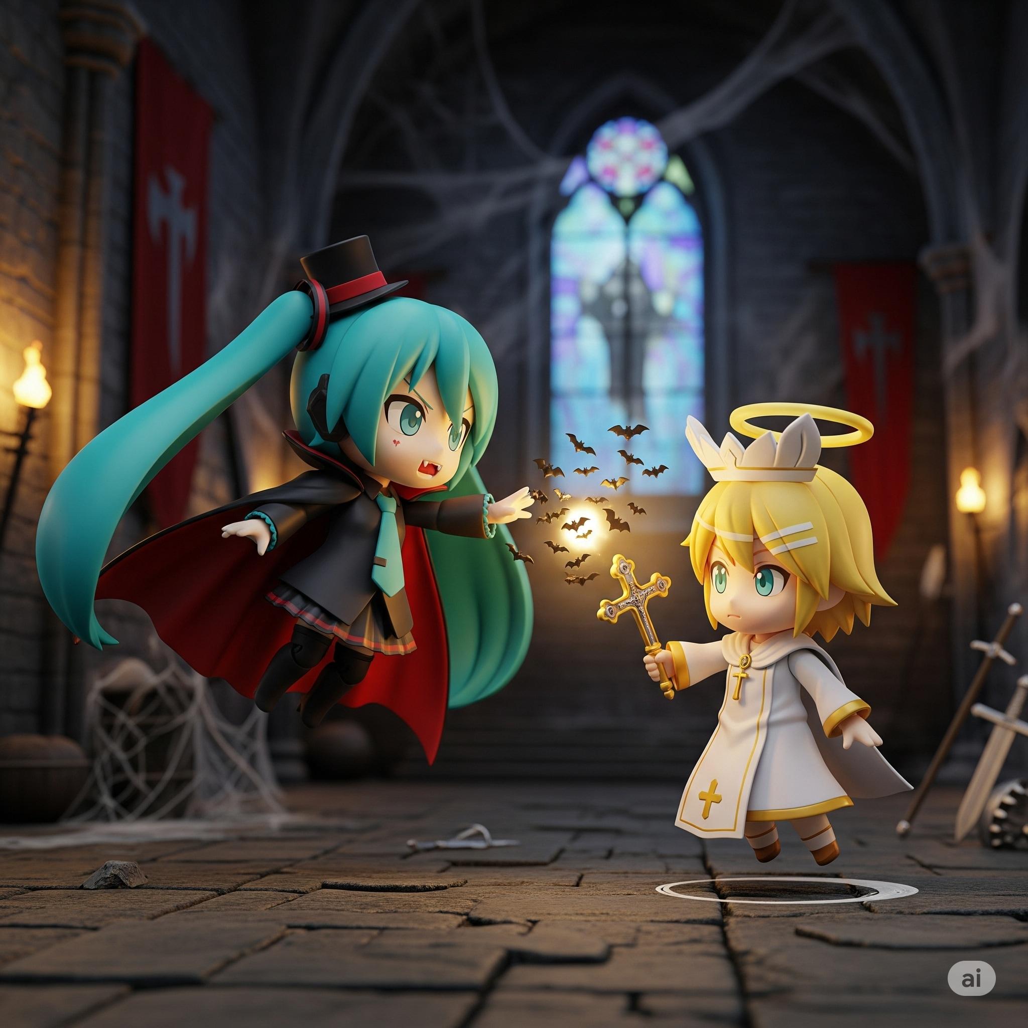2枚目のミクちゃんとリンちゃんの光と闇の戦いの大人バージョンです