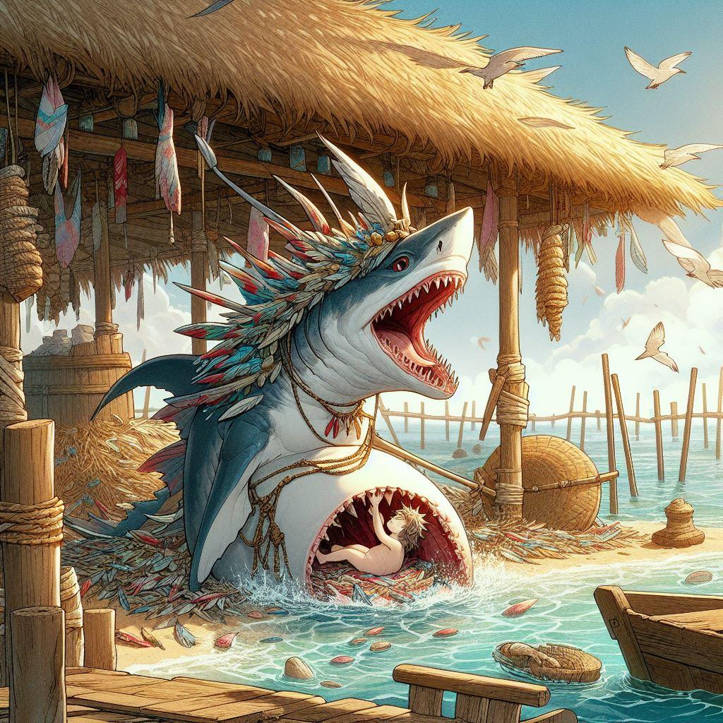 豊玉毘売は出産にあたり巨大なサメの姿になったところを夫のホオリに見られてしまう