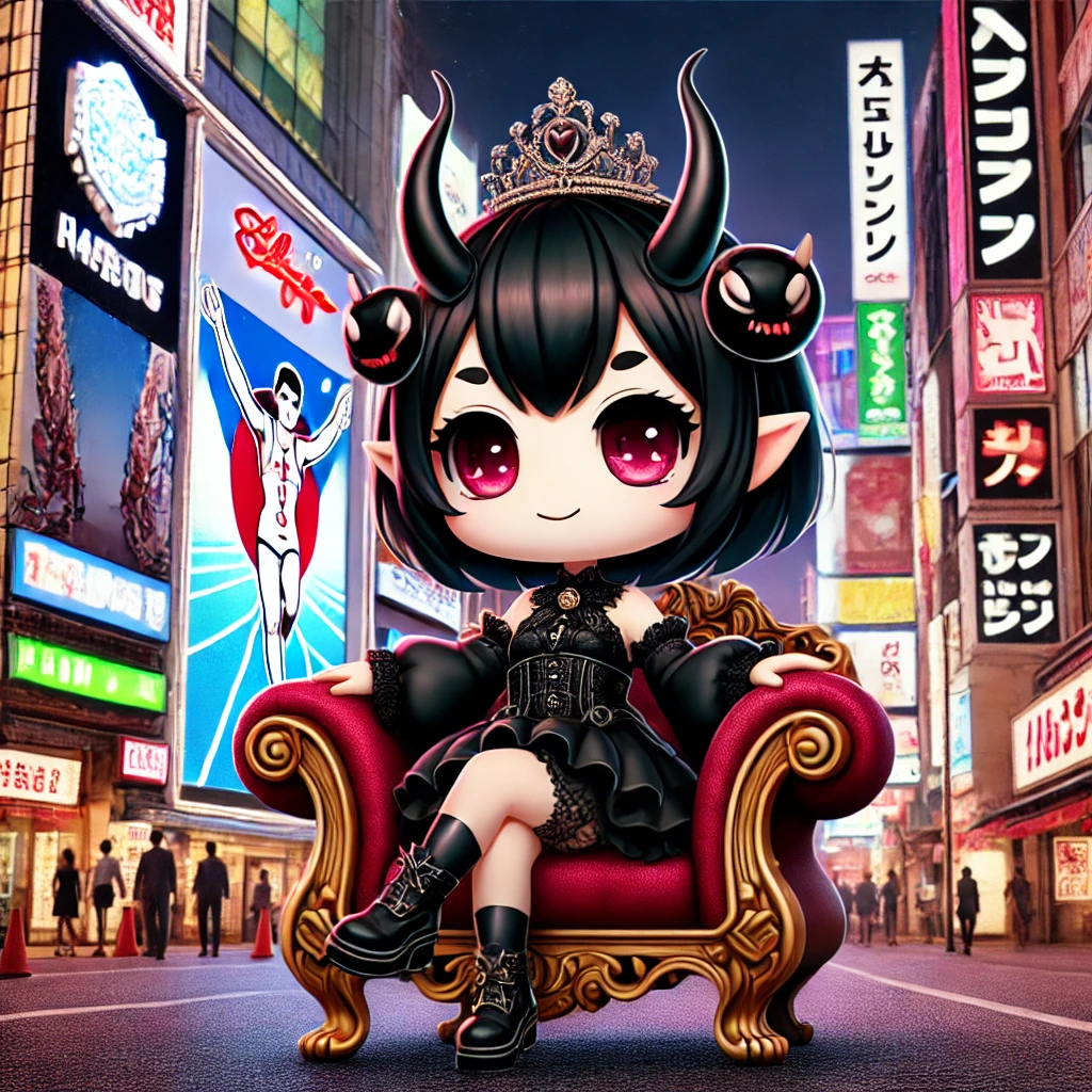 煌びやかなネオン街の中心、豪奢な椅子に座る「くろほうちゃん」。その眼差しは鋭く、彼女を見上げる群衆の欲望を見抜いている。