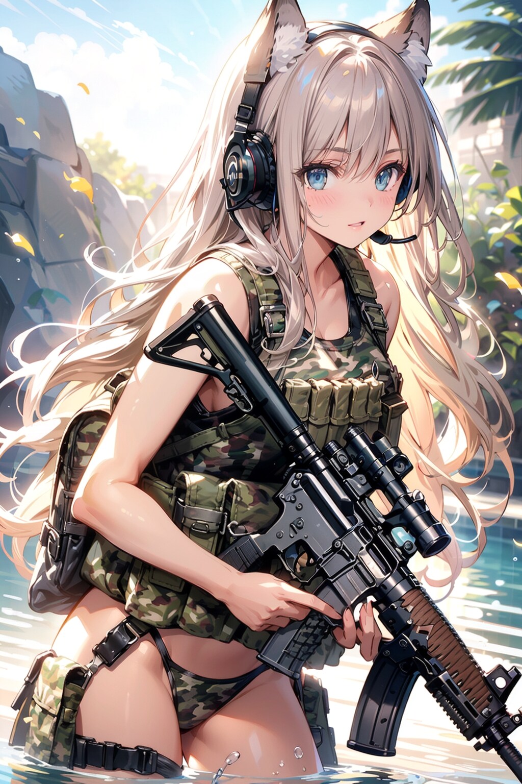 水着の上からアサルトベストを着用して各種装備を装着している👙
