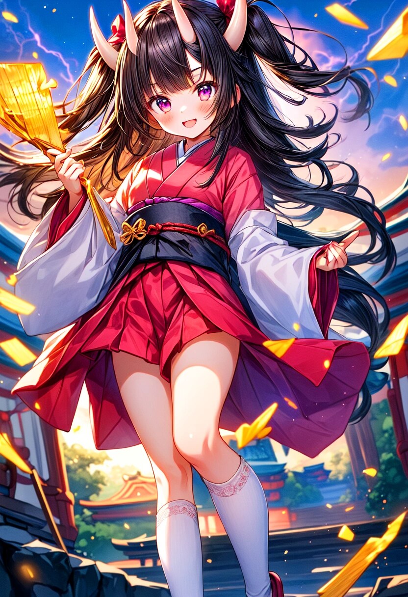 結果、鬼の角が暴走してエラいことに…!!生えすぎです~。AIイラストならではということで。金棒もプロンプトに入れましたが、金色なカードとしてしか出ませんでした!とりあえず着物とスカートが合わさった服が可愛く出てきてよかったですー。
