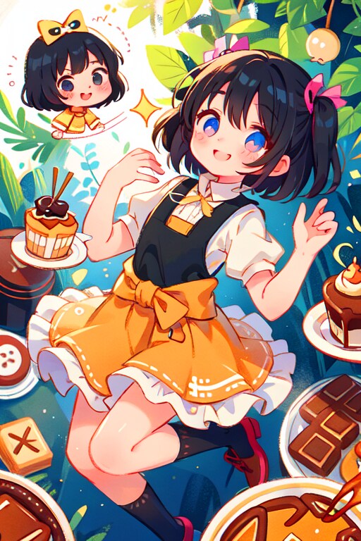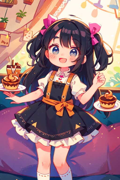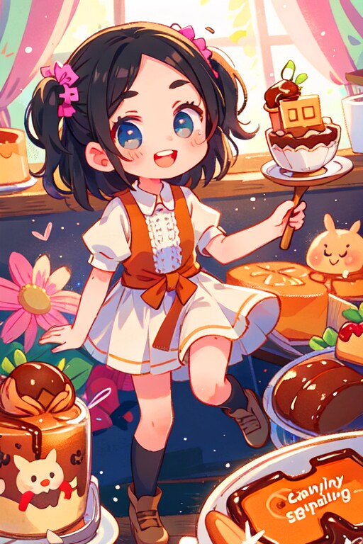 メルヘンなうちの子とプリンも生成してみました!結果、こちらだと結構プリンっぽいデザートが結構出てきてよかったです!!笑顔も良い感じです。こういうファンシーな雰囲気もいいなと思いました。今後こういう部屋を生成してみたいです。