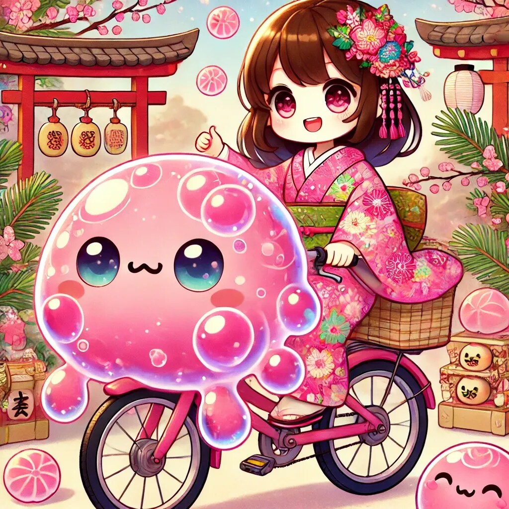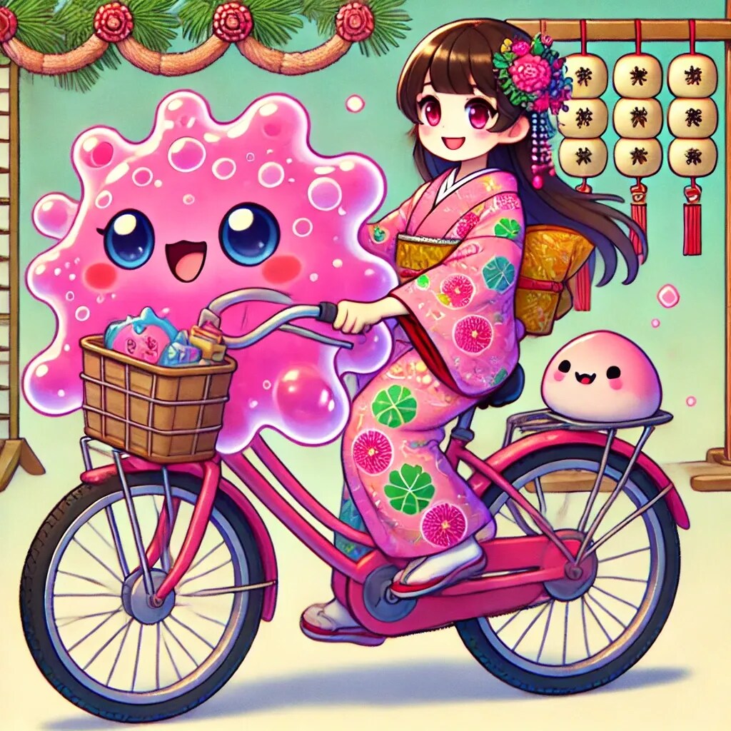着物姿の少女が楽しげにサイクリングする様子も新年らしい爽やかさを感じさせますね。🎍🚴♀️🍑
