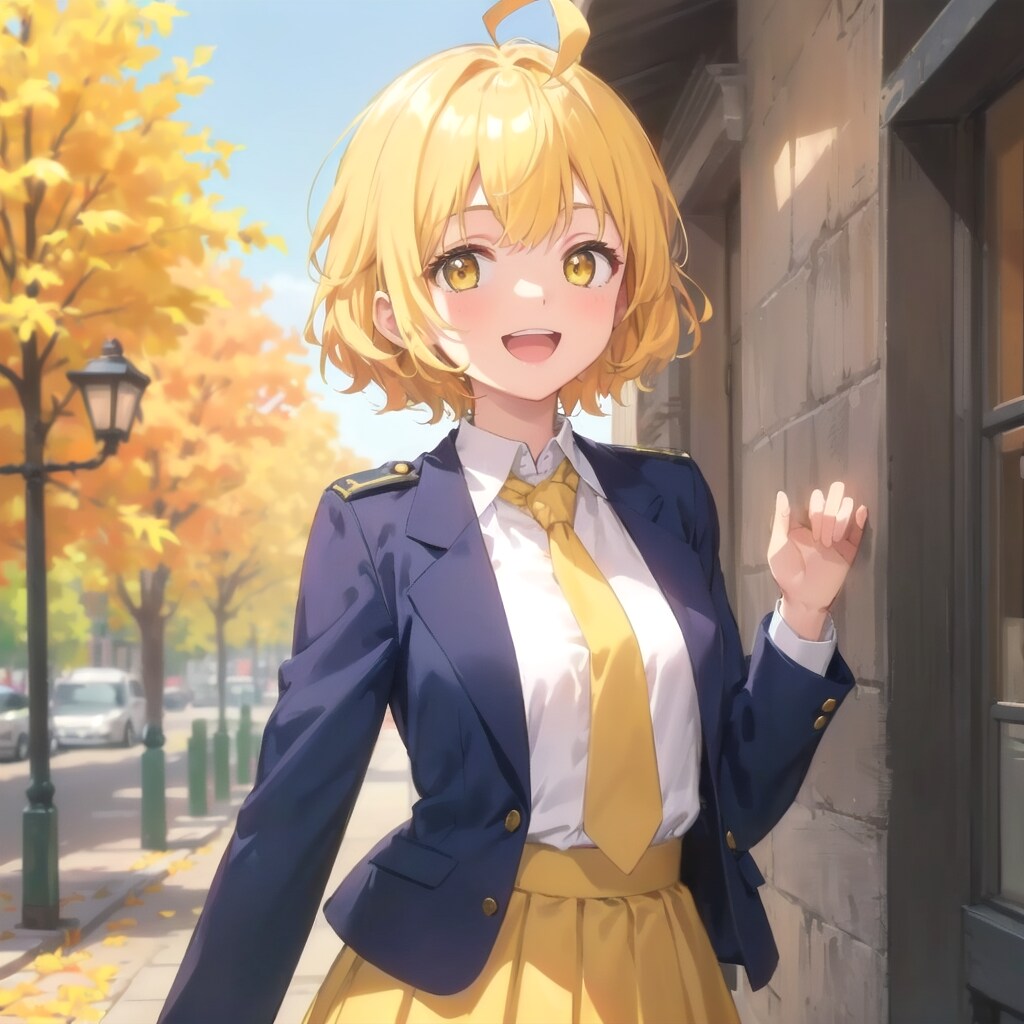 プロンプト:(best quality, masterpiece:1.3, hires), (1girl:1.4, 15 years old, from side, cowboy shot, cute), (deep yellow hair:1.3, short hair:1.3, wavy hair:1.3, swept bangs:1.2, ahoge:1.3), (open mouth:1.3, open eyes:1.2, yellow eyes:1.3, large eyes:1.1, round-angled eyes:1.3), (slender body type:1.1, small breasts:1.1),