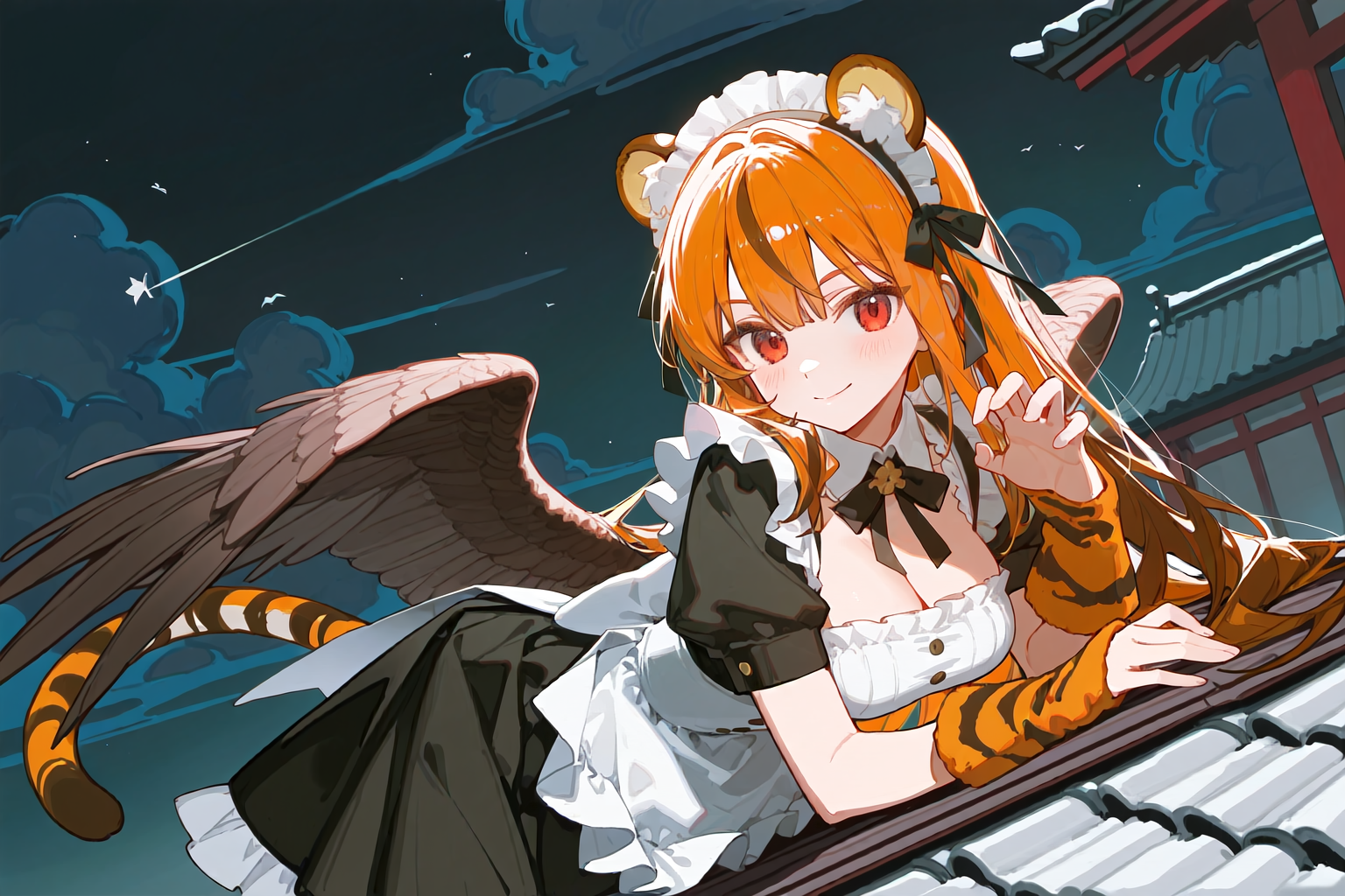 羽、虎柄、蛇、メイド服というかなり自由度の高いビジュアル構成は、伝統的な妖怪というより創作的妖怪(またはゲームキャラ)に近い