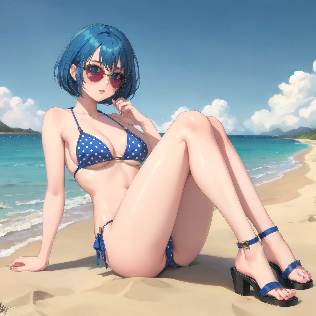 流行に流されないオシャレ上級者・ボブ子ちゃん。今年は60年代風のレトロなハイウエスト水着で、周囲の注目を一気にさらう!サングラスと一緒にポージングもバッチリ。