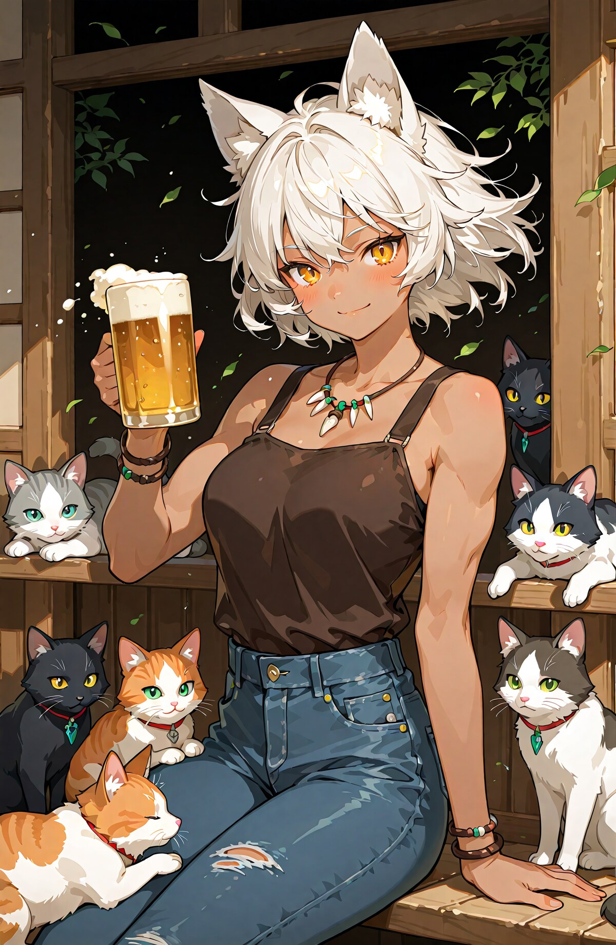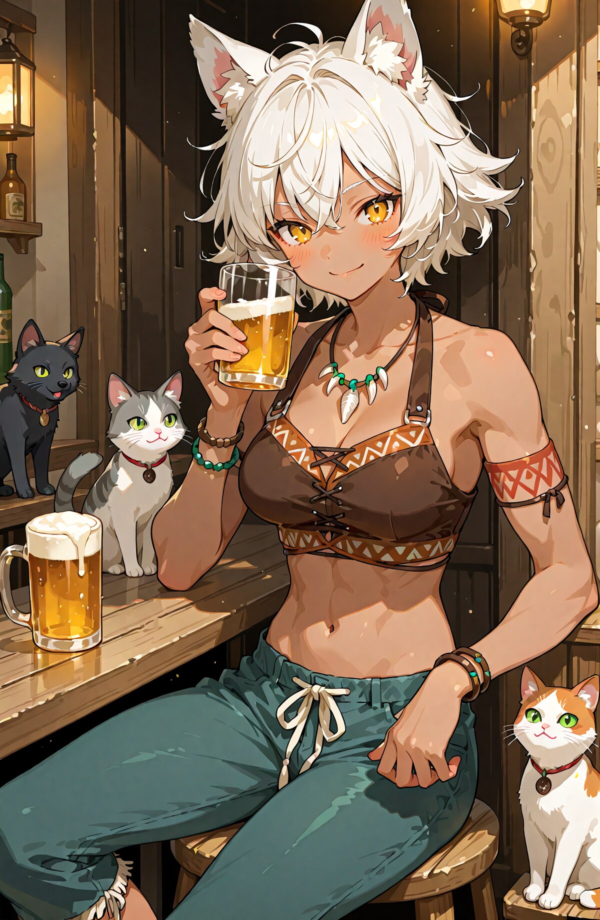 ・キャラクター的にアルコールに強そうなので、蒸留酒のジン(Gin)を試したりしたのですが酒の種類はあまり効かなかったですね。イラスト的にはカクテルや色のついたジュースで指定したほうが分かりやすそうです。おまけの1枚でビールのジョッキはちゃんと持ってくれました。