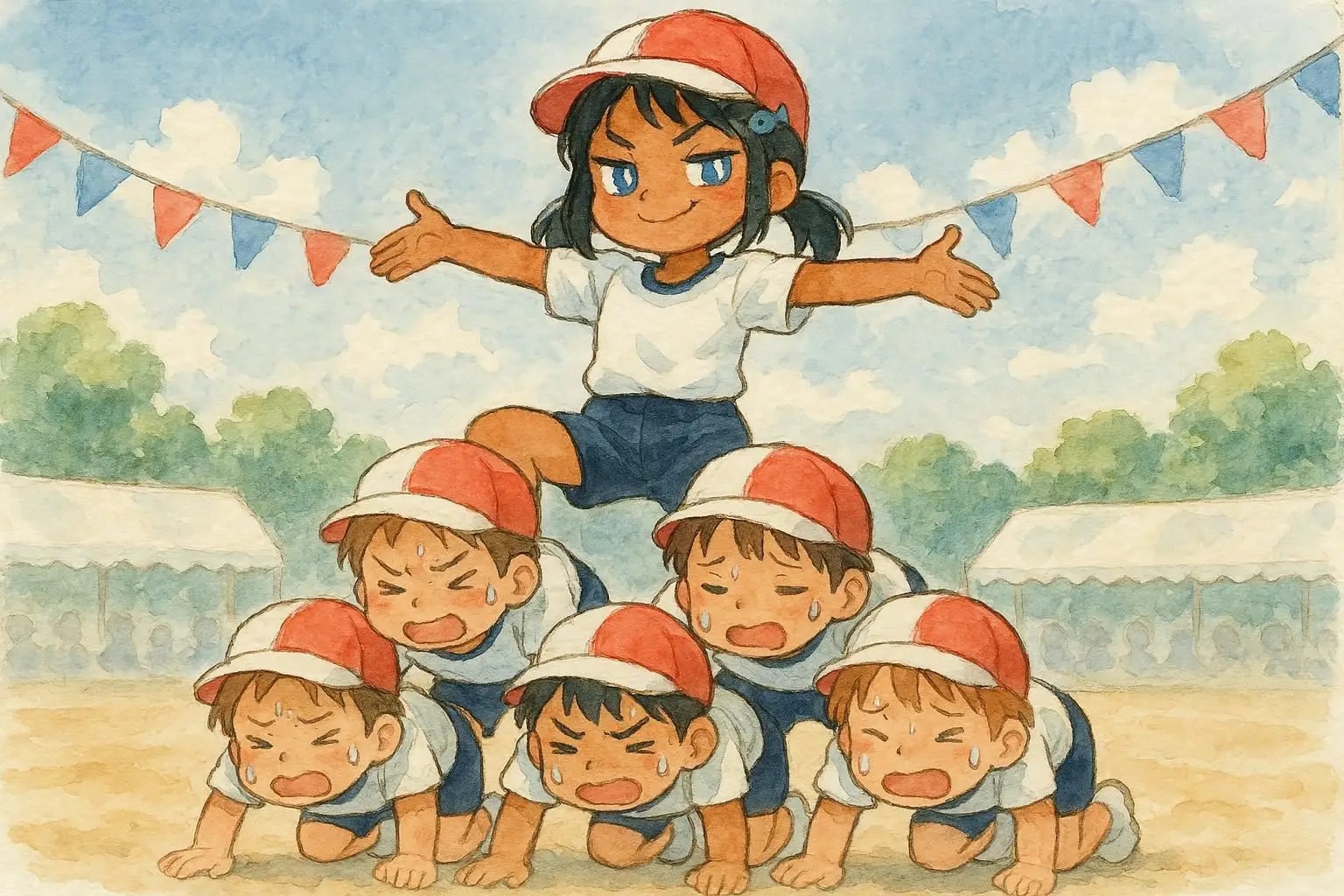 人間ピラミッドの頂点に乗るこなつちゃん。