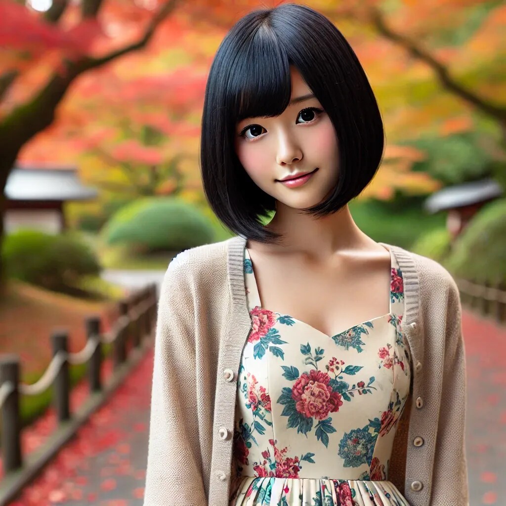 特徴:黒髪、ボブカット、黒い目、20歳、大学生、胸が小さめのスレンダー体系の女の子、日本人