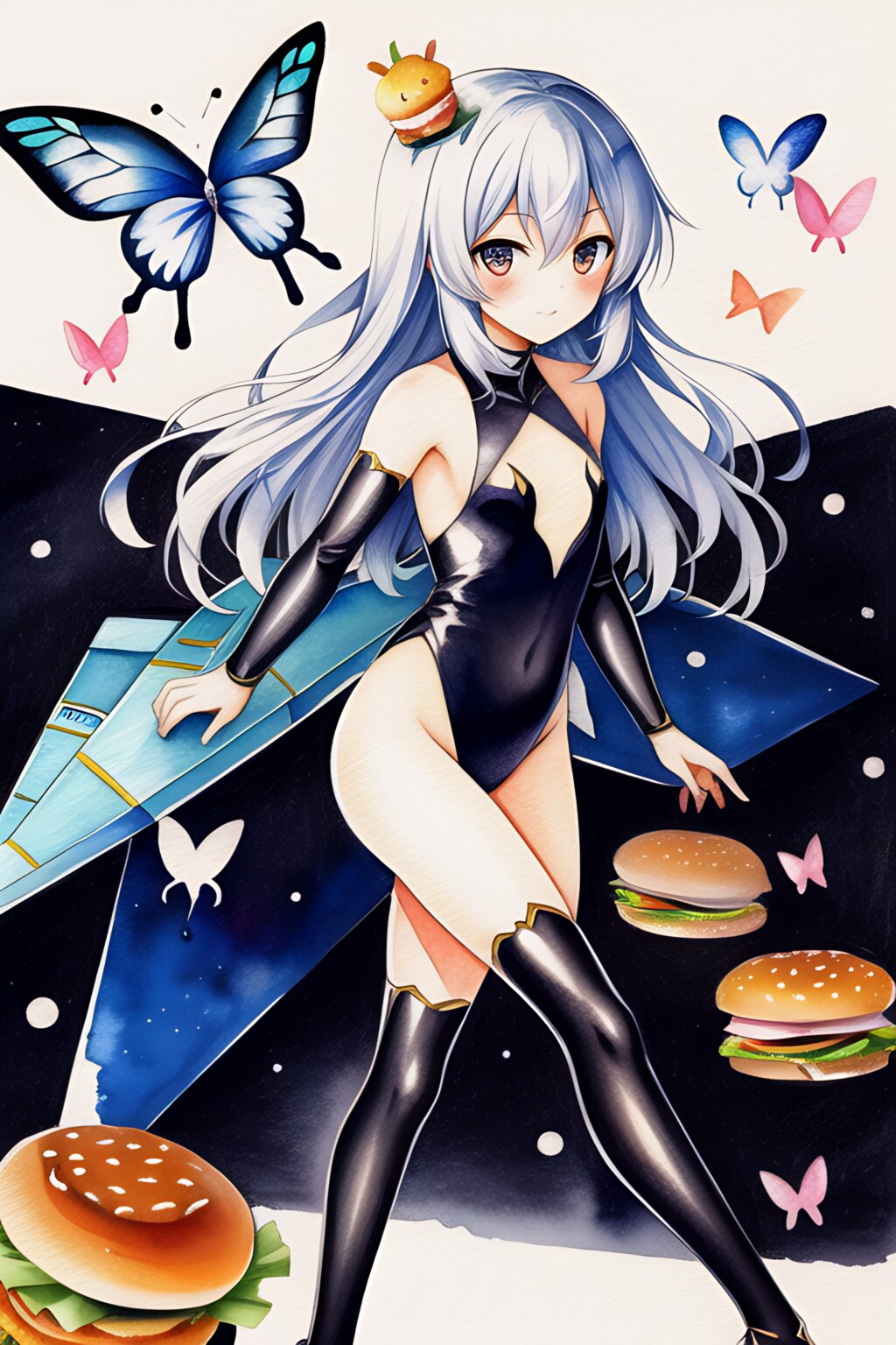 8枚目 watercolor pencil (medium) , butterfly sitting position, v arms , hamburger , contrapposto , spaceship ,