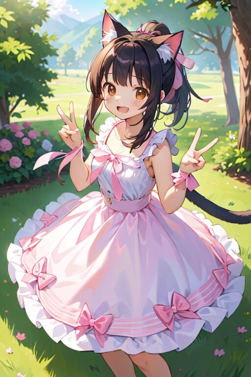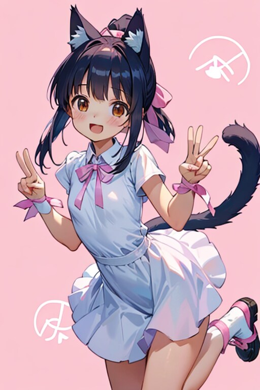 モデルはいつもの黒髪ポニーの茶瞳っ娘に猫耳(cat ears)と猫尻尾(cat tail)、ピンクリボン(pink ribbon)を付けて貰いました。