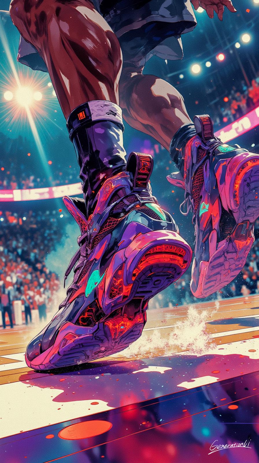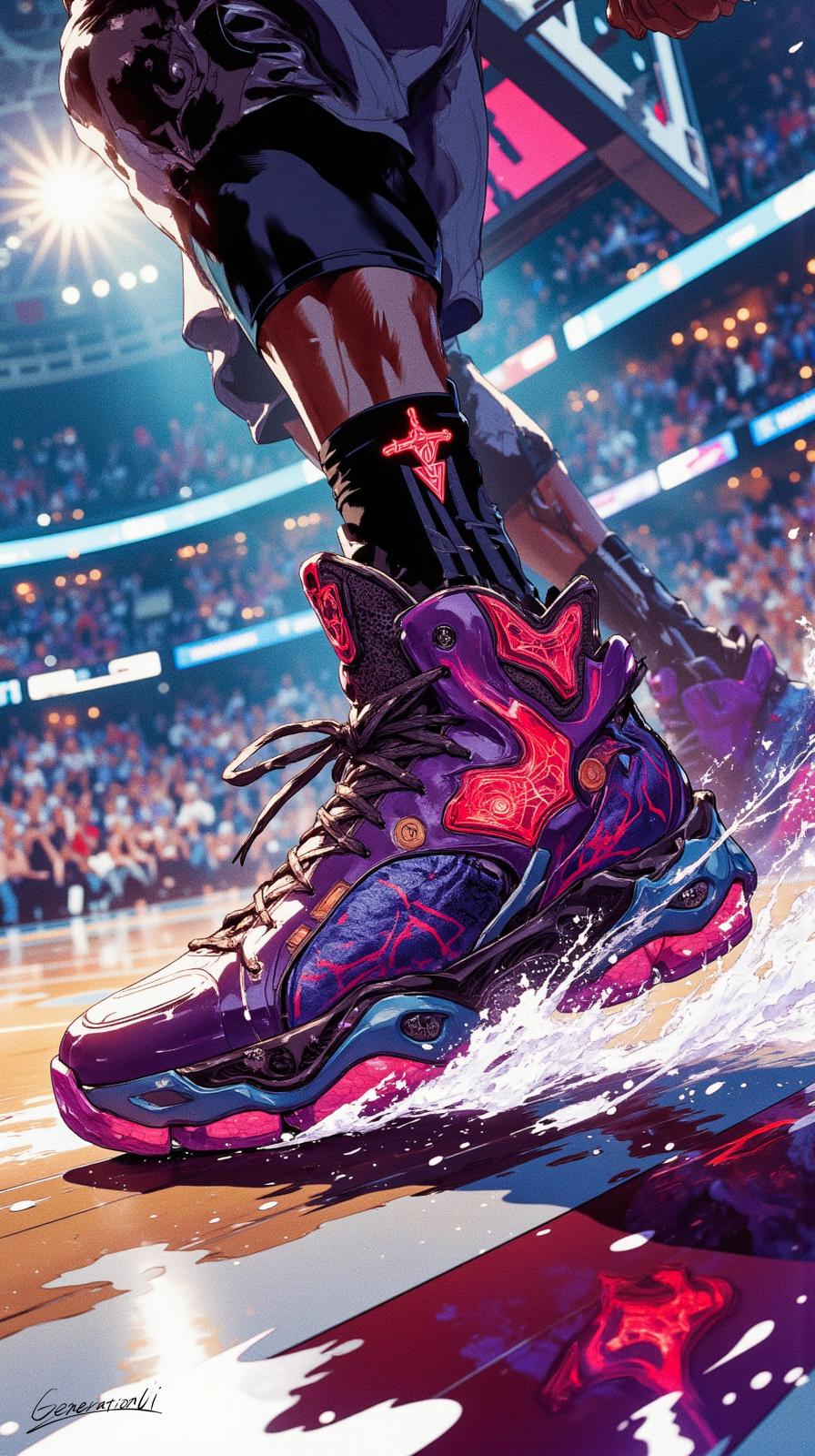 動くたびに発光し、地を裂くように床に水しぶきを上げるそのシューズは、伝説の“Generation Kicks”。