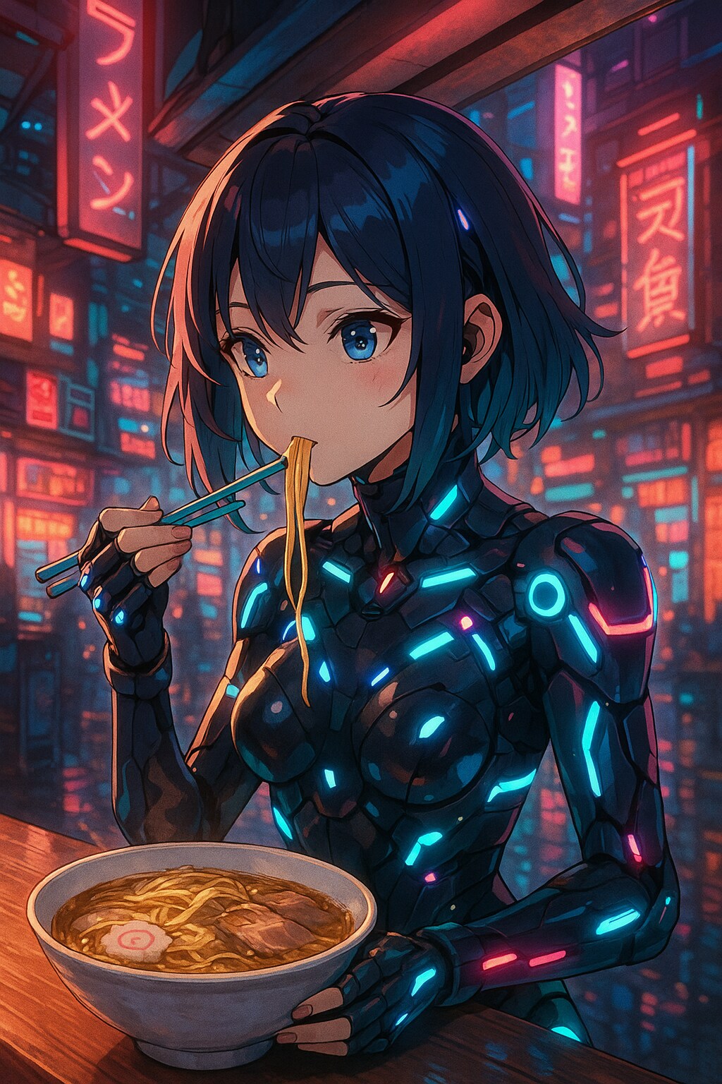 ラーメンを食べているサイバーパンクボディスーツの女の子