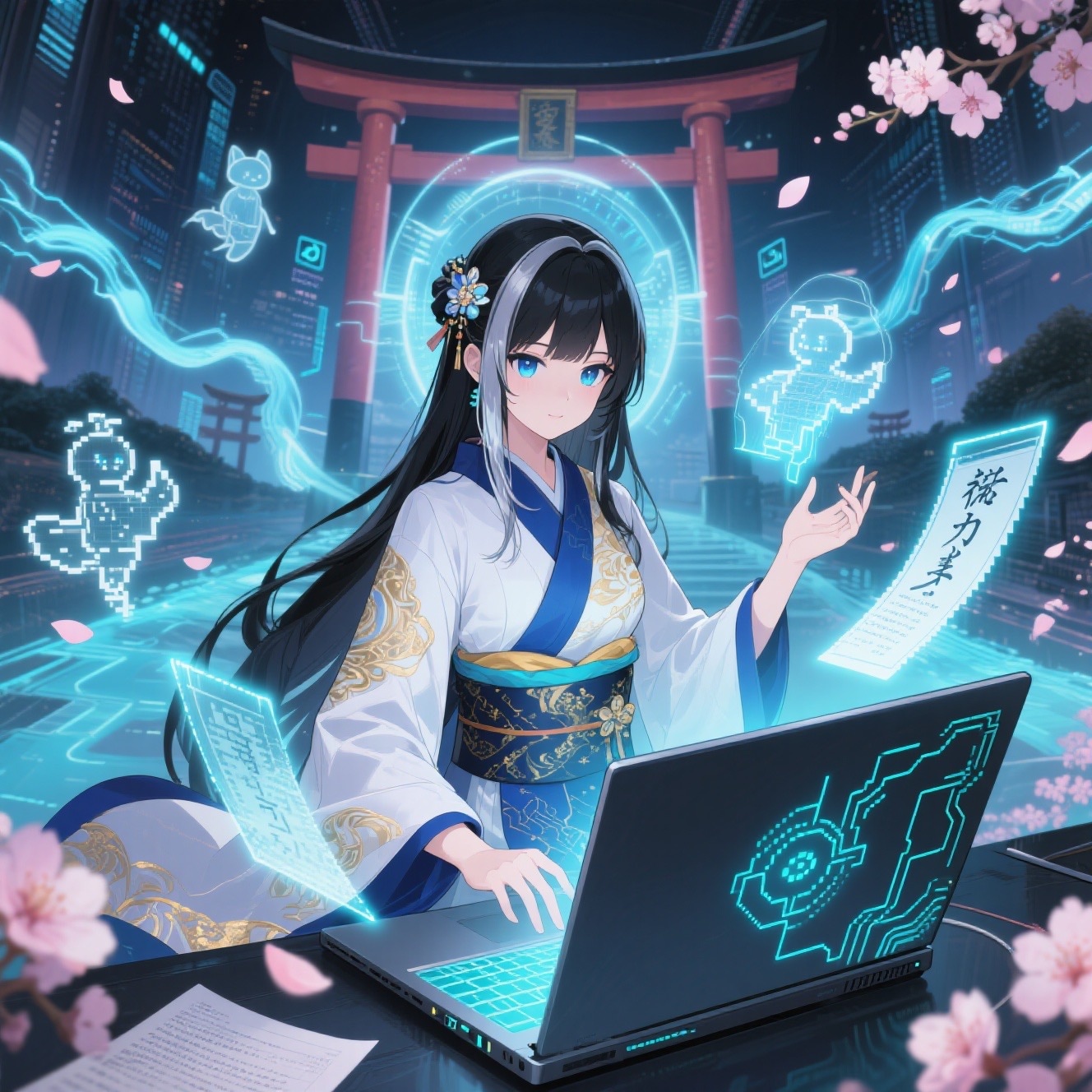 電脳朧神は、長く黒髪をたなびかせ、白と藍の着物に光る回路模様を纏い、液晶の中に神殿のようなデジタル世界を構えておりました。