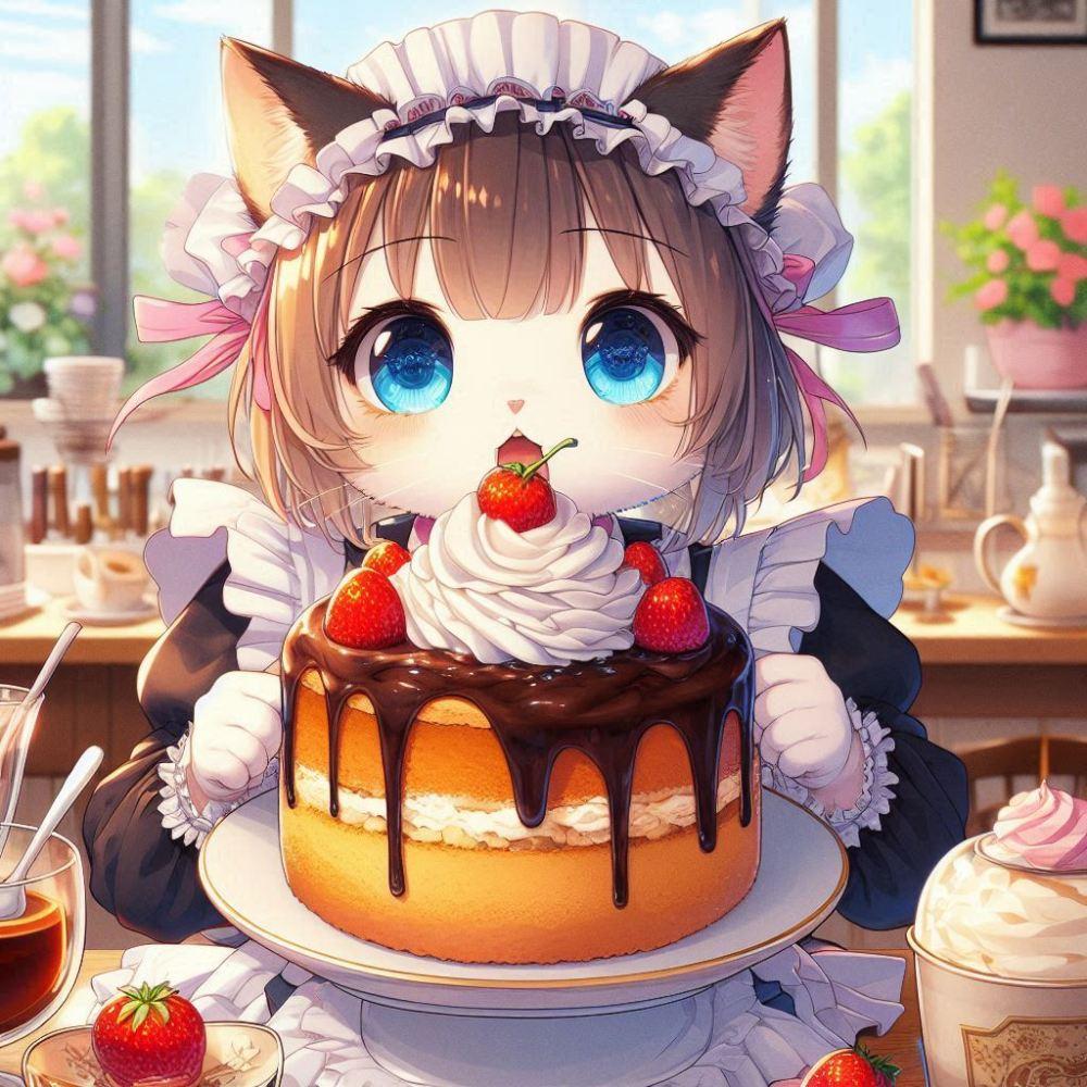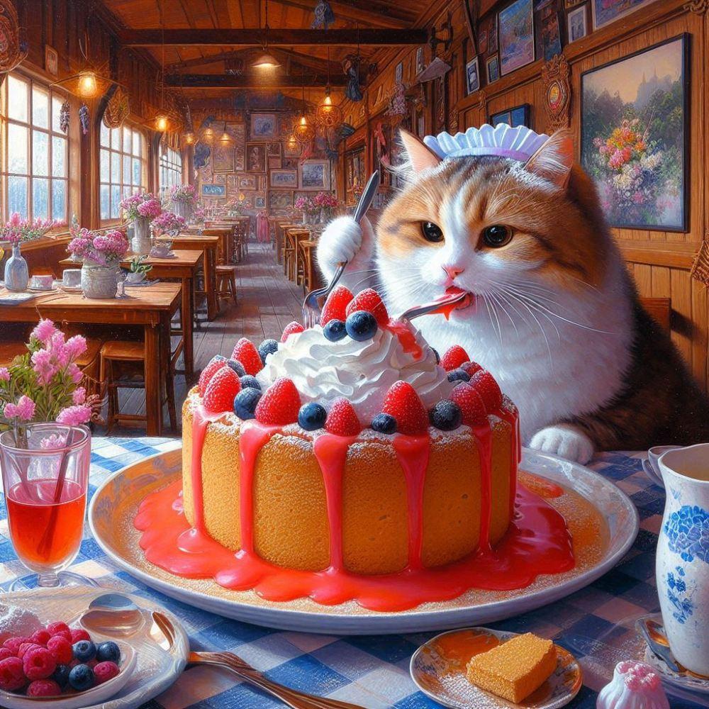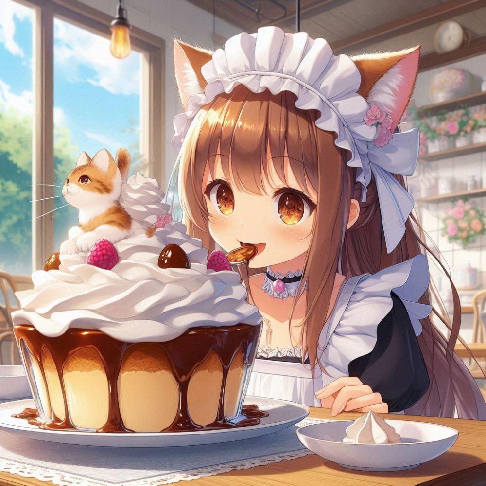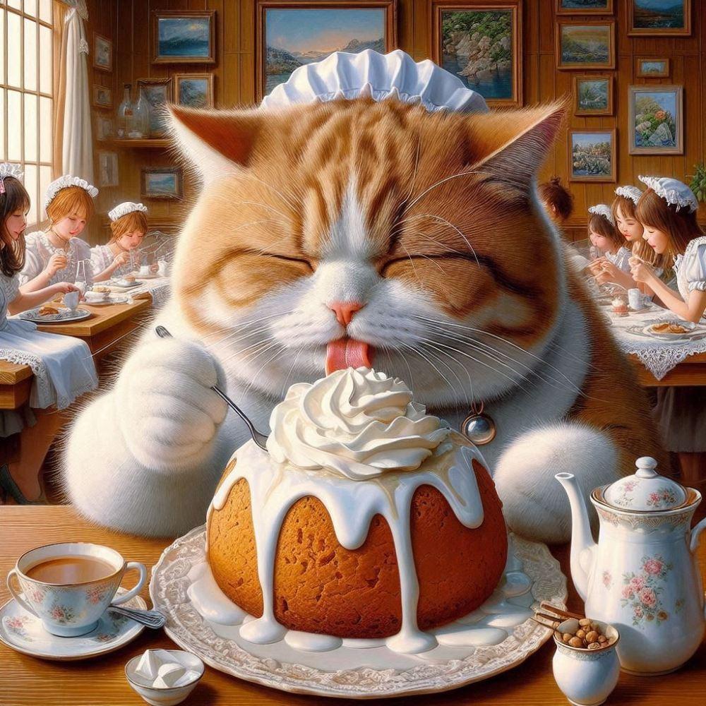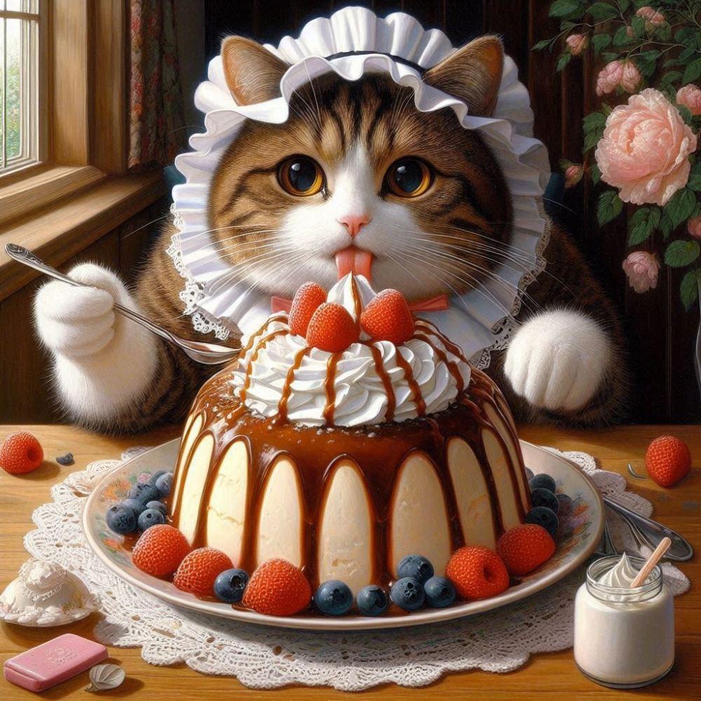 アニメ&油絵風巨大プリンアラモード食べる猫