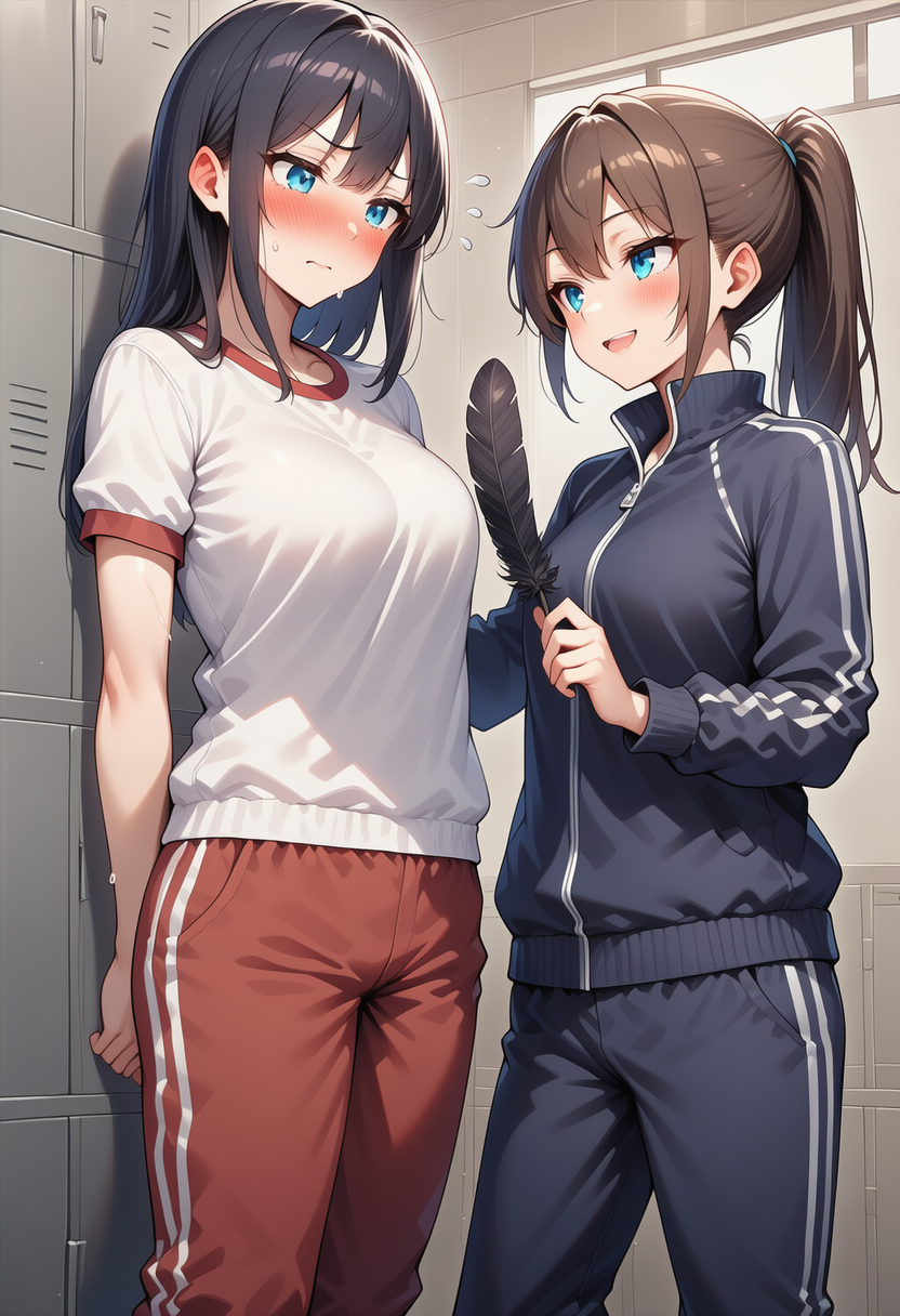 girl, standing, small breast, seductive smile, having black down feather, navy blue track suit, student, brown hair, ponytail, blue eyes, long pants, source#showing down feather,
