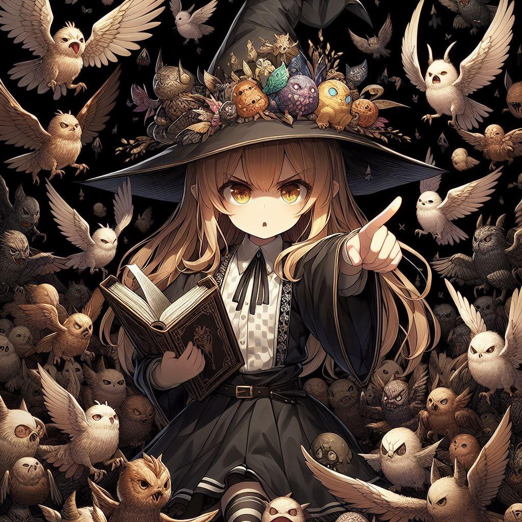 本気の表情や黒い背景、鳥の獣とシリアスな感じと、青い背景でかわいさのある表情、周りにはミニ魔女ちゃんと柔らかめなものと2種類になります!