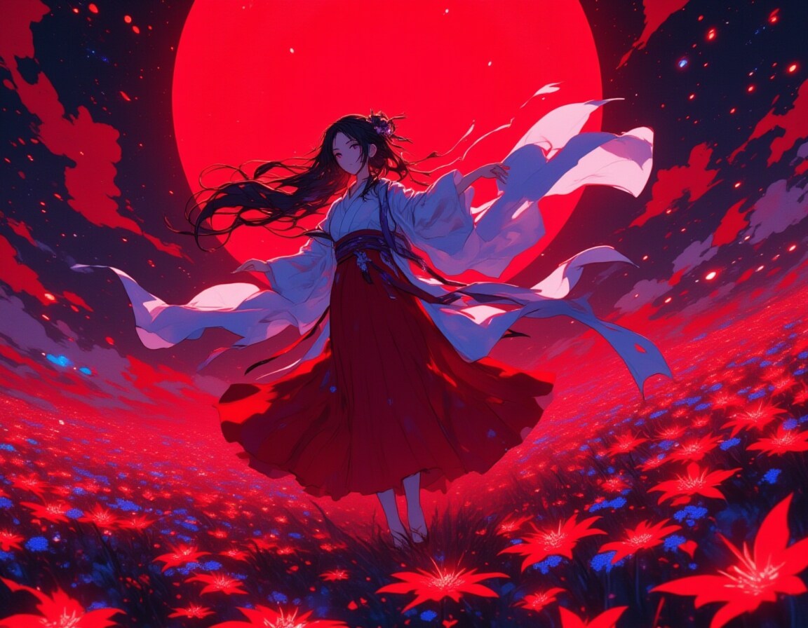 恐ろしいほど真っ赤な月の下で舞を舞い始める少女。一つ一つの所作が洗練され、動きに無駄がない。されど喜色が溢れ出るような嫋やかで艶やかな舞。