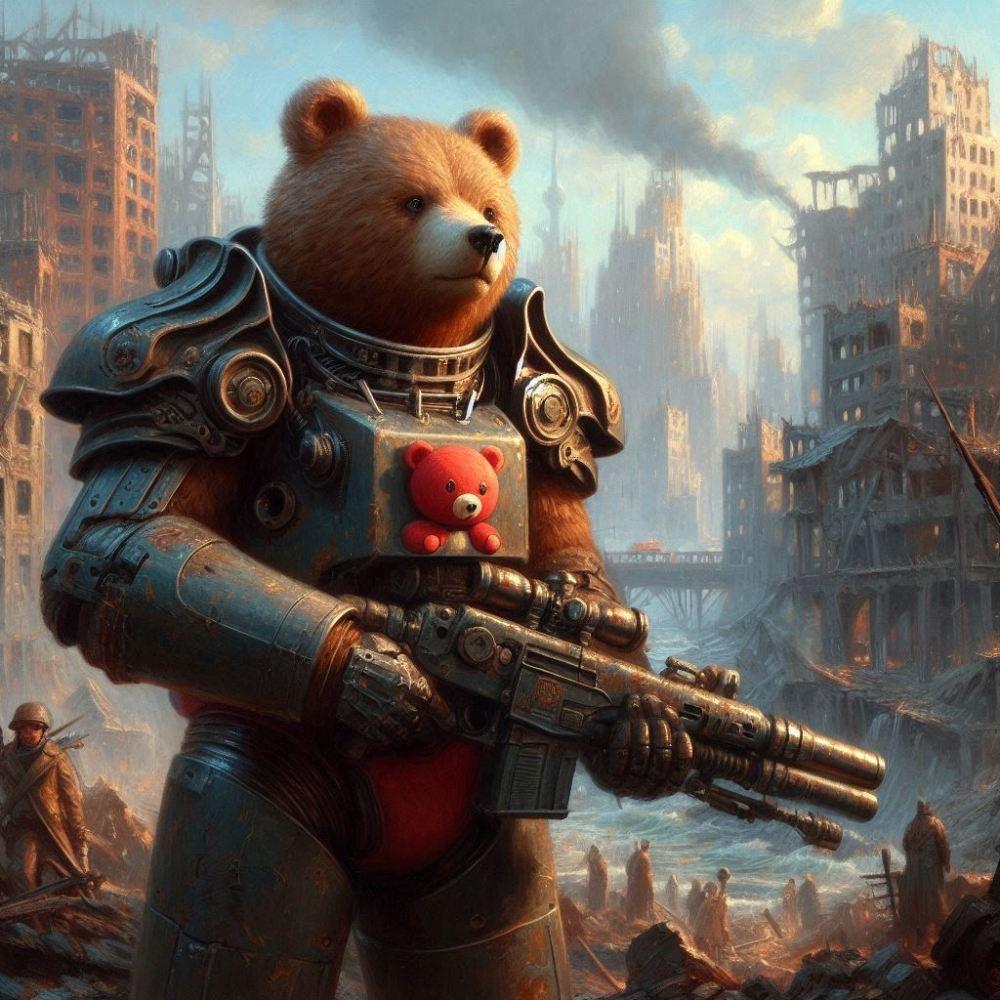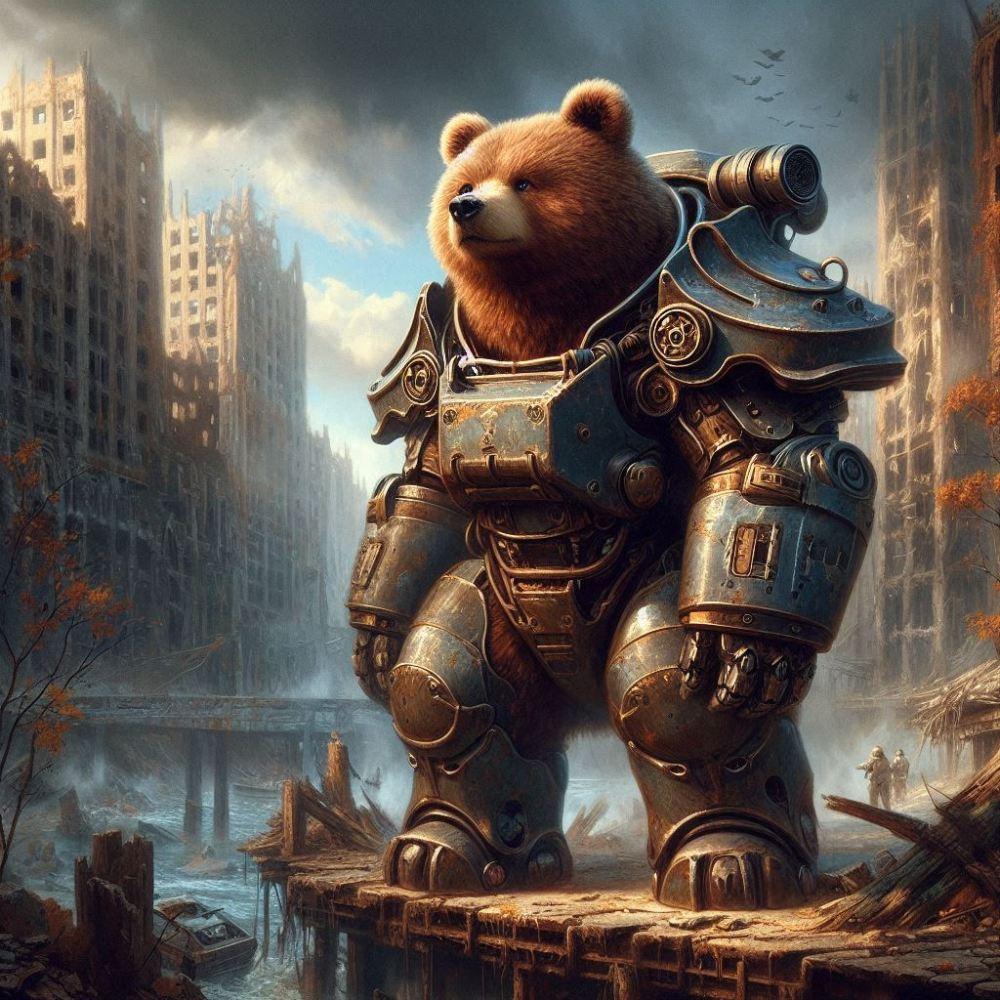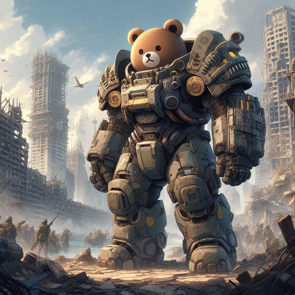 アニメ&油絵風、SF世紀末、テディベア型軍用パワーアーマーを着たヒグマが廃墟探索