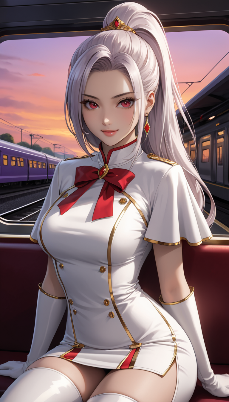 髪: HiSEのシルバー+赤の配色 → プラチナシルバーの高めポニテ+深紅リボン。