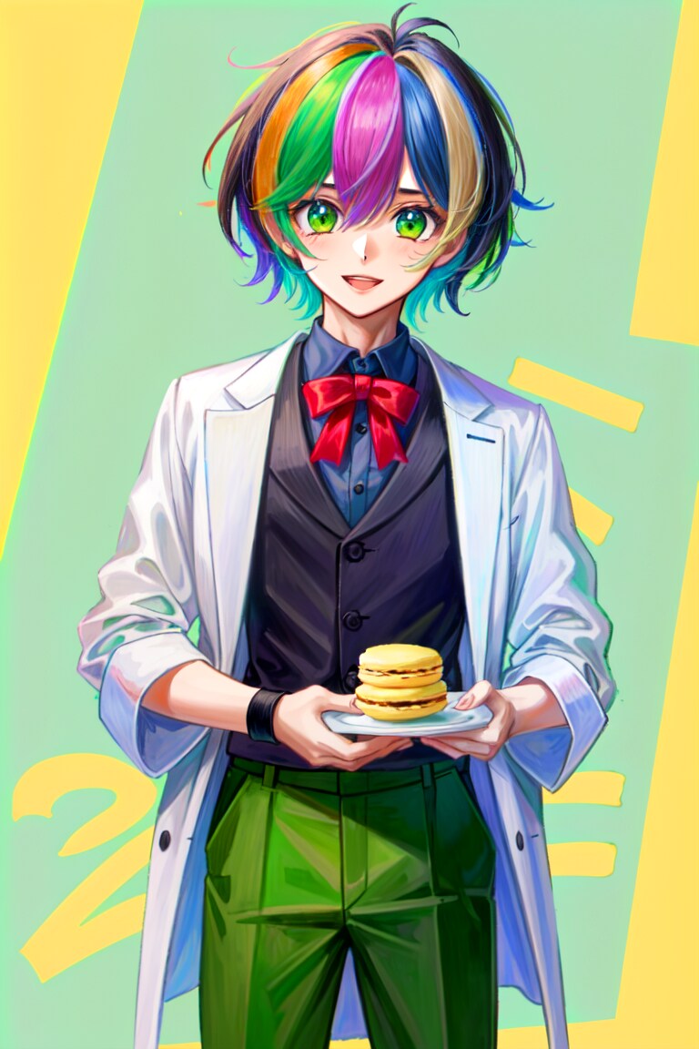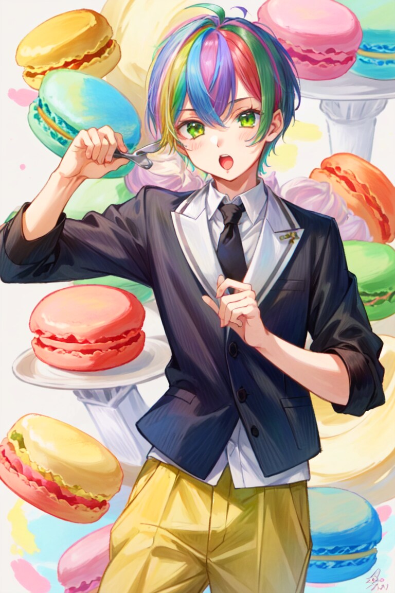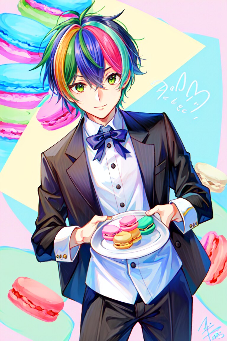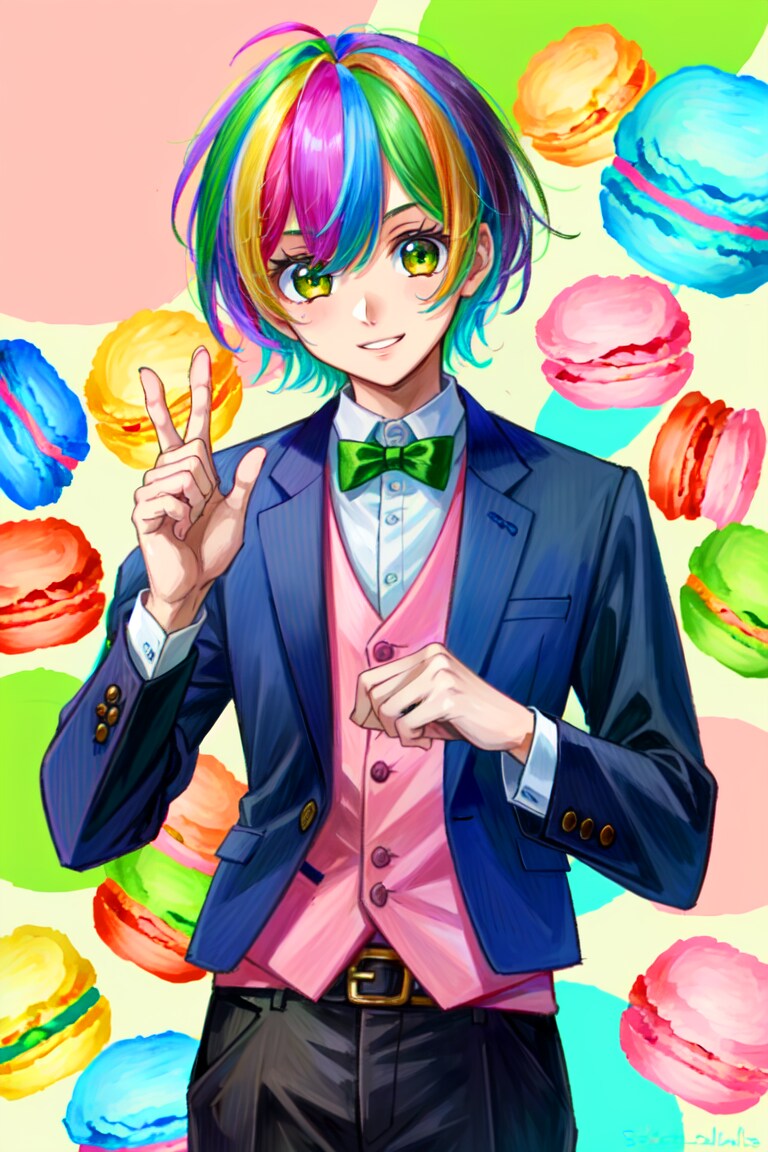 マカロンお題、たまに投稿しているブラウン髪の少年で生成してみましたー。とはいっても髪色がカラフルなため、ブラウン髪の少年と分からなくなりましたが(苦笑)男性でもカラフルな色合いになって良かったです!