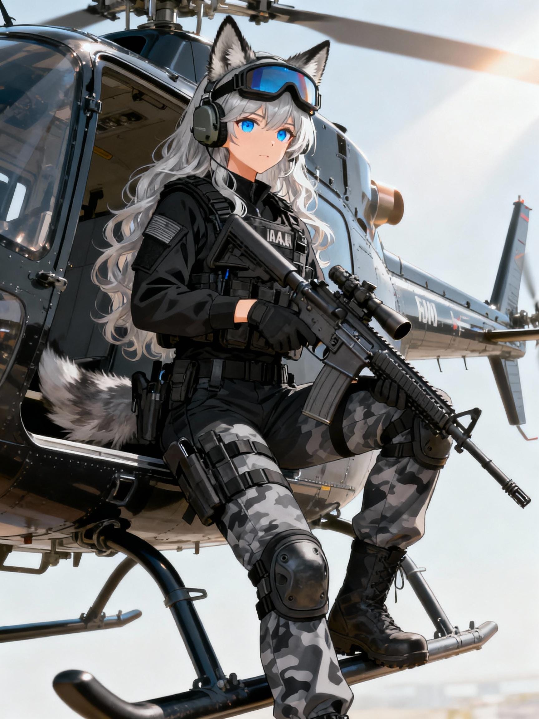 LA市警察の特殊戦術部隊「SWAT」に扮し、MD-530“リトルバード”ヘリコプターから身を乗り出すカモフラウルフちゃん🐺