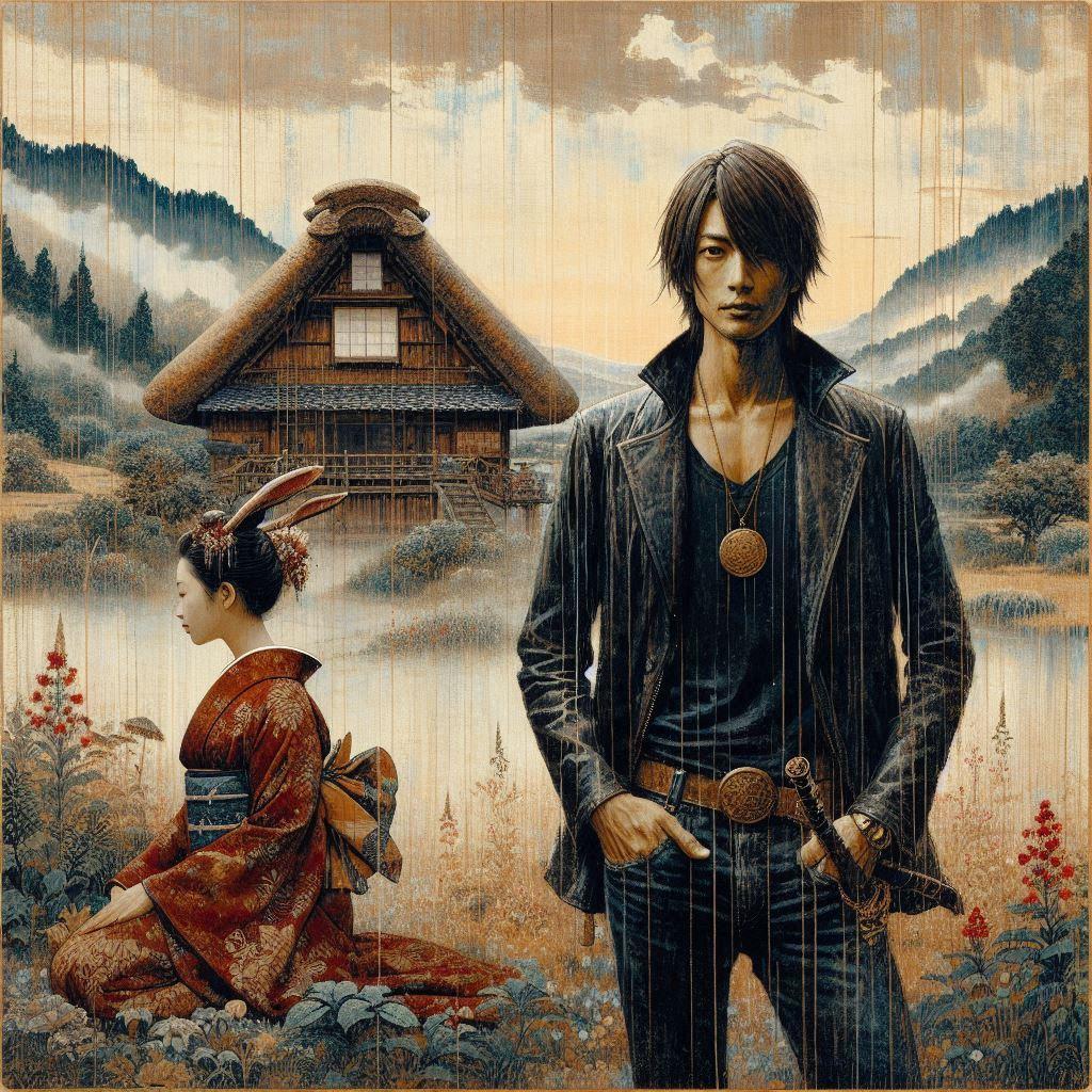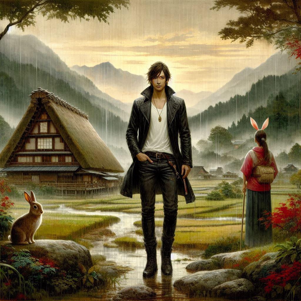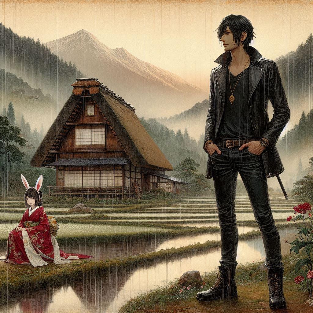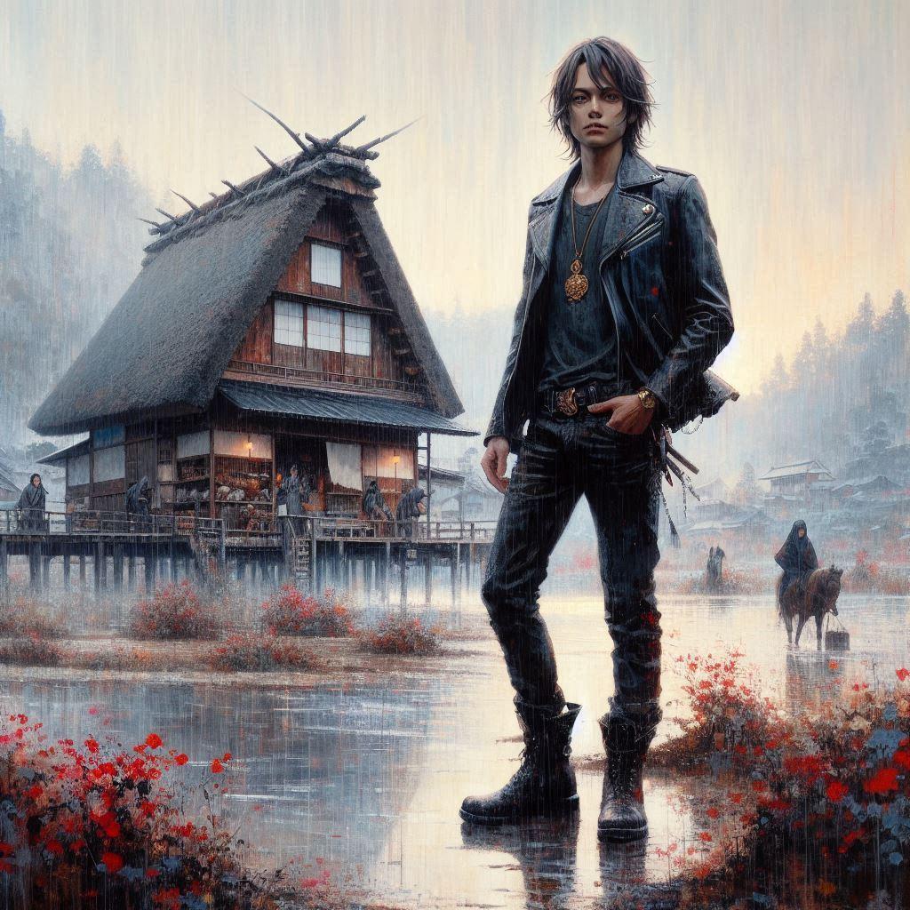 雨に濡れた中世日本の田舎の風景