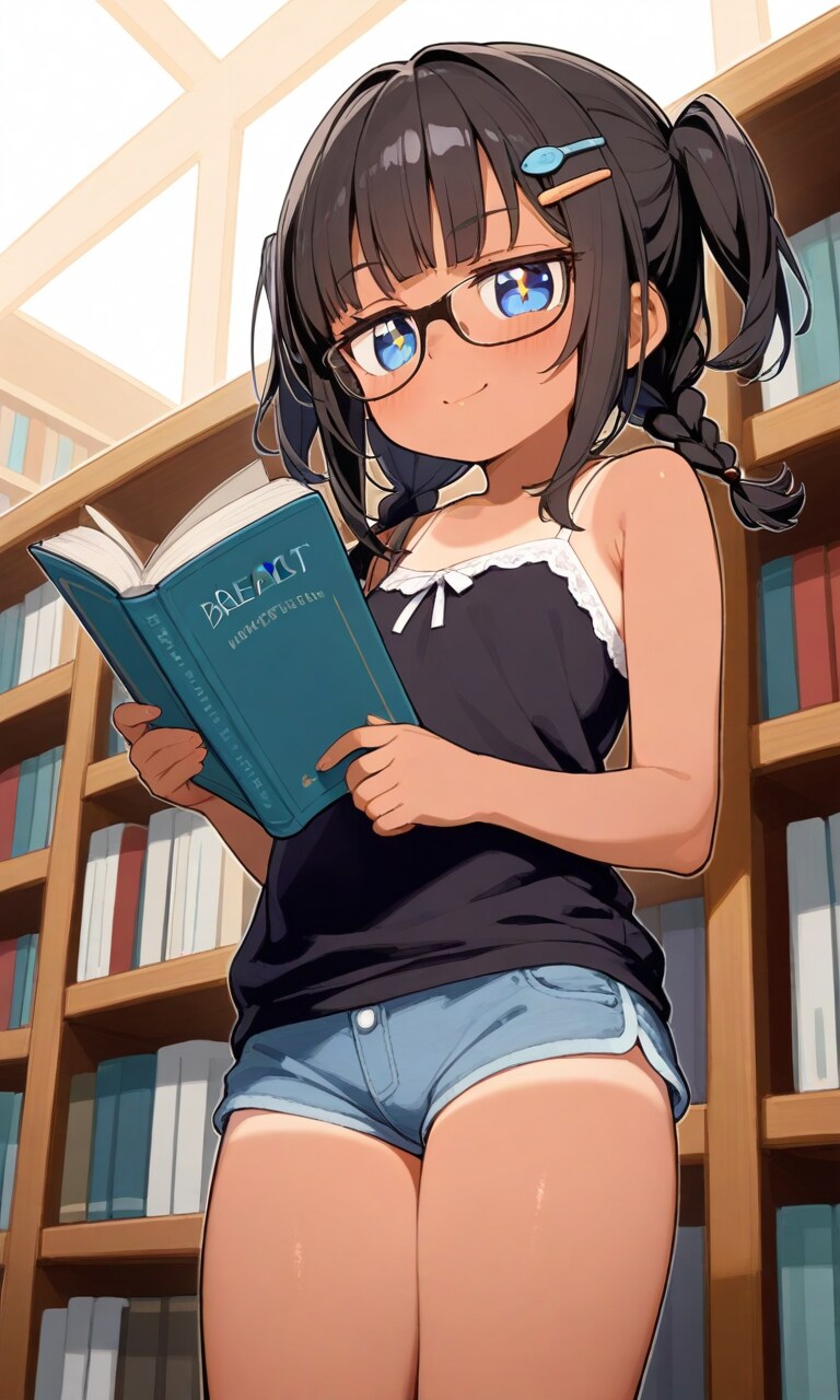 結果は、割とすんなりと眼鏡三つ編みのこなつちゃんが出来上がりました。出づらい要素に強調を入れたりする程度でしたね。眼鏡三つ編み化に伴い図書館に来ていただきました。