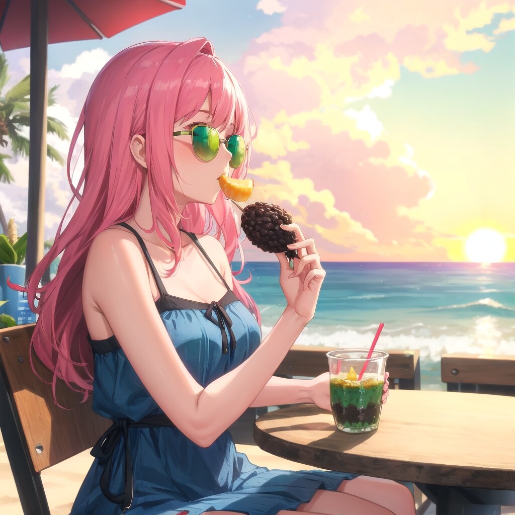 青髪ボブ子ちゃんの姉が、ビーチサイドのカフェでヘルシーなアサイーボウルを食べています。トレンド感のある夏のワンピースにサングラスをかけ、色鮮やかなフルーツがトッピングされたボウルをスプーンですくっています。海の波が夕日を反射してキラキラと輝き、ヤシの木がそよ風に揺れるリラックスしたトロピカルな雰囲気が広がっています。